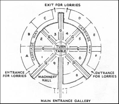 The Verona cold storage warehouse is of circular shape, and consists of three concentric rings. The core of the building is a circular hall of 80 ft. in diameter and 98-1/2 ft. high. Practically the whole floor is occupied by a turn-table which can carry two trucks at a time. A railway line connects the hall through the main entrance gallery with the shunting lines leading to the goods station. This arrangement ensures rapid and easy communication between the warehouse and the freight trains. Besides this main gallery there are seven other galleries, each provided with a railway track from the central hall. These galleries have each a width of 18 ft., part of which is occupied by a loading ramp running alongside the railway track. Four of the galleries have each a length of 72 ft. and hold two trucks ; one gallery is 114 ft. long and holds three trucks. The remaining two galleries are each 136 ft. long and hold four trucks. These last two galleries communicate with the exterior and with the shunting lines. The galleries are kept at low temperatures, which can be regulated at will. Their main purpose is the pre-cooling of the loaded trucks. Between the eight galleries (including the main entrance) are eight storage cells of trapezoidal shape, which are also kept at low temperatures. The eight galleries and eight storage cells occupy a circular area which forms the second ring. Round this area the ground-floor outer ring has been built, so that the diameter of the whole circular area is 360 ft. The outer ring contains the extensions of the main entrance and of the two above-mentioned communicating galleries, and also eight trapezoidal halls corresponding to the cells. In one of these halls the refrigerating machinery is installed. The other seven halls are used for different purposes. Some of them are accessible from outside, and serve as receiving rooms for produce brought by lorries from the neighbouring farms. From the receiving rooms the goods are transferred to the grading and packing rooms, whence they pass to the cold storage cells.