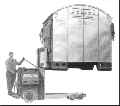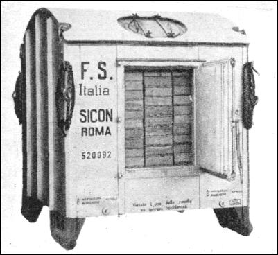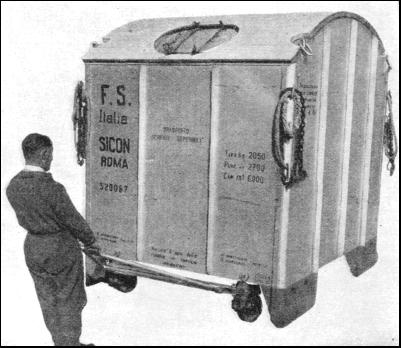 The introduction of containers as a means of transport has partly revolutionized railway transport. The advantages of containers, which avoid transhipment and the packing of goods in separate cases, have induced the Italian State Railways to investigate their possibilities when adapted to refrigerated conveyance. Here again the great value of the isothermic chamber in scientific research work became evident. It was mainly responsible for the successful introduction of refrigerated containers, which are most certainly noteworthy for the originality of their conception and execution. The refrigerated containers have external dimensions of 7 ft. 8-5/8 in. by 8 ft. 6-3/8 in. by 8 ft. 2-3/8 in. These dimensions have been chosen to enable the loading of three containers on one flat truck, keeping within the British standard loading gauge, so that the containers may travel on British railways. The containers rest on four legs ; this facilitates their handling in various ways. Thus a barrow can be pushed underneath, or an electrically-operated trolley with a low platform, on which the container is placed and driven through the streets. Or use may be made of a frame on rollers and attached to a small motor tractor. The ease with which these containers can be taken from one place to another is particularly important when loading fresh fruit, as they can be brought direct to the orchards where the fruit is grown and loaded on the spot almost direct from the tree. This prevents repeated handling of the fruit, as well as transhipment operations.