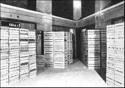 The control and measurement devices are installed outside the cells in a separate chamber. They consist of indicators and controllers of temperature agreeing with the thermostats within the cells. There is also the central apparatus which indicates the temperature and humidity corresponding to that of the thermometers and hygrometers in the cells. A multiple registration apparatus gives sixty simultaneous readings derived from sixty thermo-couples which are used for tests in various points of the cells, and within the loaded trucks or containers. These thermo-couples are particularly important for measuring the inside temperature of the loaded trucks at the various points. Thus it is possible to find out for certain whether the air in the loaded trucks is equally distributed. This is a most important point, and tests are continually being carried out with loaded and refrigerated trucks. The thermocouples are often inserted into the pulp of the fruit at different points of the truck to test the penetration of the cold air inside the fruit. A perfectly uniform distribution of refrigerated air, within the truck, circulating through the shelves and trays containing the fresh fruit, is necessary to ensure that the whole load will reach its destination unimpaired.