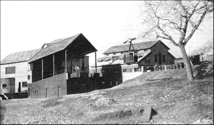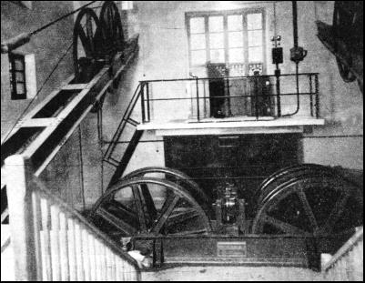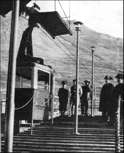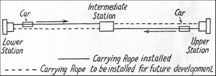 The carrying ropes are supported by five steel lattice supports, three of which are in the lower section. The maximum span of 1,012 ft. is in the upper section. The height of the supports varies according to their position, the maximum being 102 ft. The carrying ropes of the two sections are equal in length. The ropes of the lower and the upper sections are anchored in the lower and upper terminus stations respectively. Both are kept taut by tension counterweights suspended in wells, which have been built in the intermediate station. The carrying rope has a diameter of 2-3/64 in. and is made up of 133 wires. The breaking strength is about 190 tons. The traction rope consists of six strands of nineteen wires over a hemp core and has a diameter of 15/16 in., the breaking strength being 37 tons. It is fixed to the cars at the ends facing the upper station. The ballast rope of six strands of twelve wires has a diameter of 25/32 in. and is fixed at the rear of the cars. The braking rope is a characteristic feature of the Ceretti and Tanfani system. It forms a closed circuit between the upper and lower termini. It is wound round a separate pulley in the lower station, and the tension is kept constant by counterweights at the upper station. The braking rope moves at the same speed, and in the same direction as the traction rope, running through the brake clutches, which are normally kept open by the effect of the tension of the traction and ballast ropes. When for any reason the tension of either of these two ropes falls below the predetermined limit, the brake clutches close tightly on the braking rope. This action simultaneously operates the electro-magnetic brake of the driving plant and brings it to a standstill. Even if the traction rope breaks, the cars are still able to run, since by the above arrangement the braking rope automatically assumes the function of the traction rope Should this occur the electro-magnetic brake is switched off by the operator.