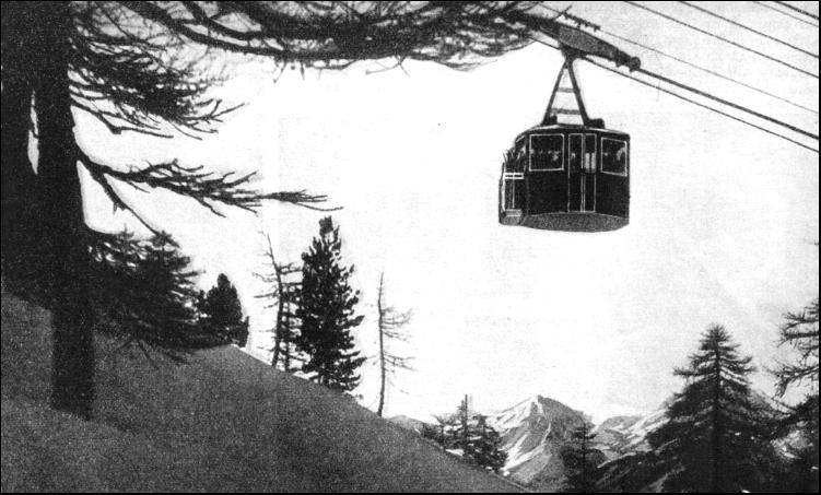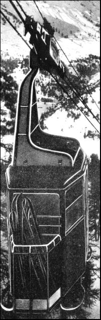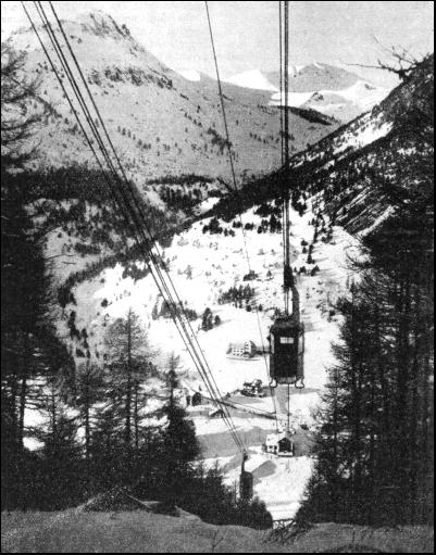 The electro-magnetic brakes operate automatically in the event of failure of the current feeding the traction motor. Such an interruption may occur through a break-down in the motor or whenever the driver shuts off the current. The current is automatically switched off when the automatic brakes of the cars come into action. The automatic brakes of the driving plant operate whenever a car, before arriving at any of the three stations, has passed the distance margin at an excessive speed ; also when, through inattention of the driver, a car approaches any of the stations at an excessive speed. In fact, the brakes come into action whenever the speed on the line exceeds the normal service speed by more than twenty per cent. In each of the three stations, and on the steel support, special wind-speed indicators are fixed. These light powerful electric lamps to show whenever the pressure of the wind exceeds 4.1 lb. per square foot, the limit at which the service is allowed to be maintained under Government regulations. The passenger cars are built of light metal alloy. The upper part has large sliding windows which permit an uninterrupted view. The folding door opens inwards and is fitted with an automatic safety lock that closes when the car starts moving. A special steadying device attached to the suspension of the car prevents excessive oscillations and ensures perfectly smooth running. On the outside of the cars basket-like metal containers and projecting metal hoops serve to carry the skis. A trap-door in the roof gives access to the carriers ; thus the brake and the other mechanical parts can be inspected while the car is moving. Each car seats twenty passengers and the driver. A battery of accumulators lights the interior and the powerful headlights. The cars are connected by telephone with the stations and with one another. A special trolley is fixed on the roofs to collect the low-tension telephone current from the telephone wires. These are stretched above the carrying rope, and are supported by special insulators fixed on the steel trestles of the line. The Aerial Ropeway of the Gran Sasso was opened for traffic in October 1934. It may be regarded as a typical and up-to-date example of an aerial line. Nothing has been omitted to ensure the safety of the passengers. Not less interesting is the Aerial Ropeway from Clavières to Pian del Sole. This also is built on the Ceretti and Tanfani system, but its short length has made unnecessary the division into two sections and the erection of an intermediate station.