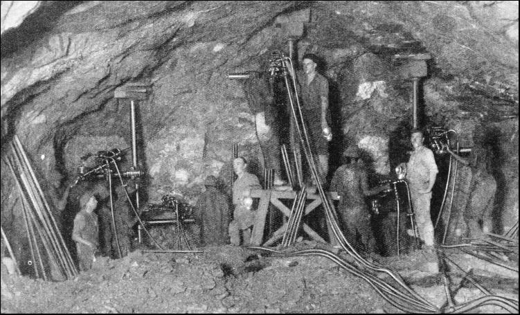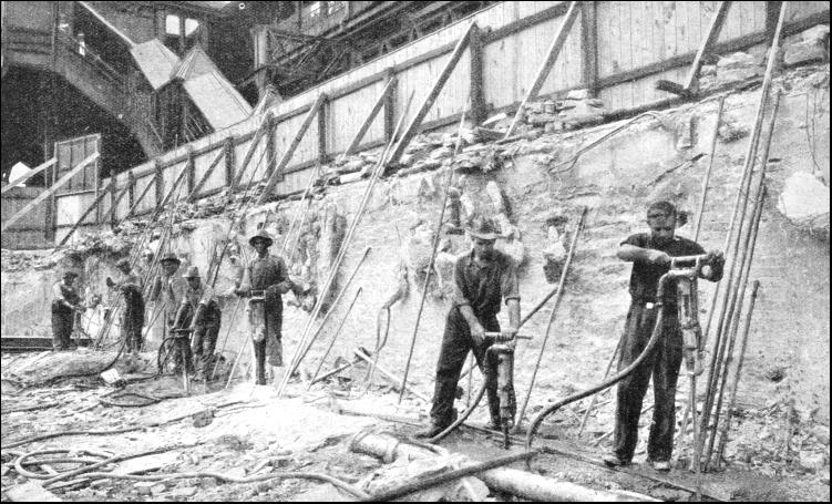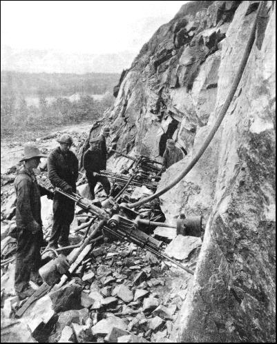 Hand-power drilling was first used in England in the Clifton Tunnel, on the Clifton Extension Railway, in 1874 The tunnel was driven through mountain limestone, and an old-fashioned machine known as the "Beaumont Diamond Rock Drill" was brought into action after the work had already been in progress for some time. This machine was worked by compressed air, and immediately it began to operate the rate of progress was three and a half times that done of hand labour. Here, again, the cost of the work done by the power drill was higher than that of hand labour, but the speed obtained by its use more than compensated for this. It soon became evident that a rock drill, to be successful, had to be simply made, light yet strong in every part, and provided with as few moving parts as mechanically possible. After the completion of the Hoosac Tunnel, in America, a much lighter and simpler drill appeared. This machine, known as the "Ingersoll," was used on some forty-two of the fifty important tunnels which have been driven in America since the Hoosac Tunnel was built. The most noteworthy of these tunnels was not a railway tunnel, but the New York Aqueduct Tunnel, which was thirty miles long, and was bored in about two years—a remarkable feat of engineering. Shafts were sunk about one mile apart along the line, and the tunnel bored from shaft to shaft, over the whole thirty miles. The record speed for driving, obtained when twenty-three miles of tunnel had been driven, was an advance of over 48-1/2 ft. in one week. Until the early part of the 20th century the boring of holes was done "dry." It was, however, found that it took a much longer time to bore dry holes by what is known as the reciprocity type of rock drills than when water was employed.