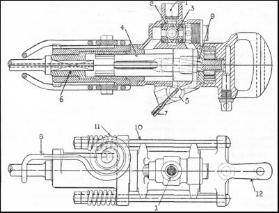 The drills of the hammer type, known as jackhammers, are universally used either as hand drills, or mounted on a cradle. The smaller machines weigh 40 to 50 lb. The big machines, known as "drifters," vary much in size, according to the ground in which they have to work. The dimensions vary from 2-5/8 in. bore to 4 in. bore. When working with heavy "drifters" mounted on cradles, two men are needed to work a machine. One is known as the drill runner, and the other as the spanner man. These two men always work together and, because of the noise produced by the drill, communicate with each other by means of signs. A complete understanding between the two makes for speed. It has been found that the time taken for drilling sixteen holes by two men who had not worked together before, decreased from four and a half hours on the first day to three and a half hours on the second, and to three hours on the third day. This work was done on fairly hard rock. The light machines are used in smaller soft rock tunnels, and the larger "drifter" machines in driving large tunnels in hard rock. All the "drifter" machines, when used in tunnelling, are equipped with water injection for the prevention of dust and the removal of cuttings from the hole. In Great Britain, so far, the authorities are satisfied with the squirting of water down the hollow drill steel to lay the dust, but in South Africa the Department of Mines will not pass any drill unless equipped with what is known as a ventilating cover. The light "drifter" type of drill, 3 in. and 3-1/2 in. diameter, is mostly used for shaft sinking where the drilling speed is very high. When used for this purpose, such drills are removed from the cradle and mounted on spring handles ; they weigh 85 to 110 lb. each. "Sloping" machines are, to all intents, jackhammers mounted on a column which keeps the drill up to its work. The .modern jackhammers and "drifter" drills can deliver 1,500 to 2,000 blows per minute, While the old reciprocating type delivers only 300 to 400 blows per minute. A modern type of hand hammer drill, illustrated in the diagrams above, is operated as follows : Compressed air at 70 to 80 lb. pressure is conveyed to the machine through a rubber hose and an air connexion to the opening at 1. The air enters the machine and passes through the holes in the valve cage (2), past the valve (3) into the top or right-hand end of the cylinder. It pushes the piston (4) forward until the point of the piston hits the end of the hollow drill steel. At the moment when the piston strikes the drill steel, the head of the piston passes the exhaust port (5) and allows the air to escape ; at the same time, this drop of pressure in the cylinder causes valve (3) to move over to its opposite seat, and air is admitted to the left side of the cylinder for the return stroke of the piston. On the power stroke from right to left, when the piston is hitting the drill steel (6), no rotation of the drill takes place, but on the return stroke the drill steel is rotated. When it is desired to blow out the hole, the choke valve (5) is closed by the blow-out handle (7). This shuts the exhaust and sends a blast of air down the splines or grooves of the piston, through the hollow drill steel, to the cutting bit. The hollow drill steel has, at the end opposite to that which enters the machine, a suitable cutting bit usually of the cross type which chips the rock each time the piston hits the shank end of the drill. The spring (8) is a retainer to keep the steel in place when extracting from the hole drilled. When wet drilling is desired, the machine is fitted with a water tube which passes through the rifle bar (9) and piston (4) into the hollow drill steel to convey water to the bottom of the hole. The lower diagram shows the drill in elevation; (10) being the side rods, (11) the side springs, (1) the air inlet, and (12) the handle by which the machine is held.