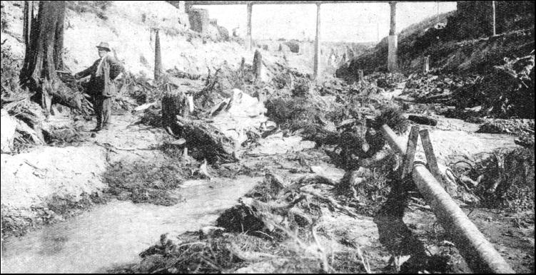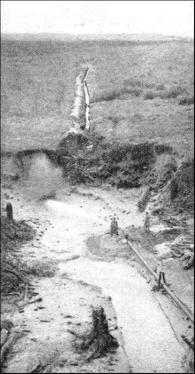 Another form of "machine-gun" used by engineers is the sluicing pump or "monitor" ; its action is known as sluicing or hydraulicking. This machine is useful only for excavating earth, sand or gravel. To carry out excavations by sluicing it is necessary to install a powerful pump, or pumps, near a river or other plentiful supply of water. From the pump a pipe of fairly large dimensions— say, 15 in. diameter—is led to the point at which it is required to start sluicing. At this point the "monitor" is placed, and the delivery pipe connected up to it. The "monitor" has a long barrel, gradually reduced from the diameter of the supply pipe to about 3-1/2 in. diameter at its nozzle. The reduction in the size ot the pipe from 15 in. to 3-1/2 in. gives a tremendous pressure which is at least 100 lb. to the square inch when it leaves the nozzle. The "monitor" is placed on a suitable bed and securely anchored down to it. It is so constructed that it can be swivelled round to act in any direction. The powerful jet of water is now directed on to the face to be excavated, and it is a wonderful sight to see the material crumble away under the great water pressure. An interesting example of sluicing is provided in New Zealand. Before work was started the ground looked perfectly normal, but when the water began to bite into the ground a buried forest became exposed. The trees were all broken off at different levels, and all showed signs of having been charred by fire. This is accounted for by volcanic action. An eruption had evidently taken place at some distant period, when red-hot cinders had fallen on the trees, setting them on fire and gradually burying the stumps completely.