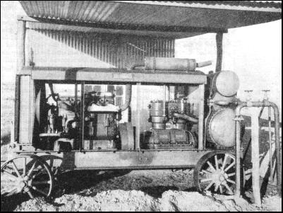 As gunpowder in one form or another is the power behind the machine-gun, so compressed air is the power behind the rock drill of today, and it will be interesting to see how this is produced. At first, air-compressing machines were all of a stationary type, and where a large quantity of compressed air was required for a large tunnel, the compressed air was supplied from a power house in which several large compressors were installed. History does not tell us who brought out the first portable air compressor. The first attempt probably consisted of taking an old-fashioned standard slow-running machine from place to place on a timber raft placed on wooden skids. The machines were, of course, run by a steam engine ; and were known as "portables." They were popular up till the end of 19th century. About 1890 the first horizontal steam-driven compressor came into being, and was used for semi-portable work. In this machine the air cylinder was mounted in front of the steam cylinder, and there was a piston rod which was common to both. A portable boiler was used for the steam power, and was moved from place to place with the compressor. These machines, with improvements of course, are used to-day, and they still prove quite suitable in certain conditions of work.