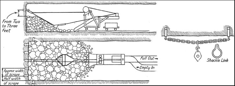 Loading limits the speed of advance in a tunnel of usual dimensions, and it is not possible to employ more than a certain number of men ; otherwise they would get into one another's way. It was, therefore, found necessary to devise some mechanical means of speeding up loading. The modern machine for this purpose is known as the scraper loader. One of the chief essentials for driving a tunnel at a rate that is both fast and economical is an effective loading device. In no other form of excavation is it so necessary that the link between breaking the rock and transporting it should be really efficient. A type of scraper loader consists of an incline or ramp running up to a horizontal platform, or jib, all set in a very strong steel frame. The driving power may be either compressed air or electricity. The driving winch has two drums, one for pulling the scraper bucket from the machine to the face, and the other for pulling back the loaded bucket to the machine. There is a large open space on the horizontal platform of the machine, so that when the truck is run in under the platform the scraper bucket can discharge its contents into it, when the bucket is pulled up to the top of the ramp. The operations are as follows : On arrival at the working face of the tunnel after a blast or, rather, at a point thirty or forty feet from the face, the apron is lowered and secured to the rails by clamps, and the electric or air motor is connected ready for use. While the above has been going on, preparations have been carried out for anchoring the tail sheaves, or blocks. Several holes are drilled at intervals across the face about two or three feet above the top of the pile of broken rock. Into these holes plugs and feathers are inserted ; or, as an alternative, one hole may be drilled on either side of the face and plugs inserted, when a chain is slung between them. A special shackle link is used with the chain, and the sheave is hung on this link. These sheaves are to allow the bucket to get at the whole pile of dislodged material. The sheave through which the tail rope is threaded is first of all hung from the centre plug, and scraping is begun. When the material along this line has all been scraped and loaded, the sheave is moved to another position, and so along from one point to another until the whole face is cleared. In tunnel work, electric battery locomotives are used to transport the rock in trains of trucks to the tunnel mouth, and so to the dumping point, or, where a tunnel runs between shafts, to the cage which takes up full trucks and brings down empty ones.