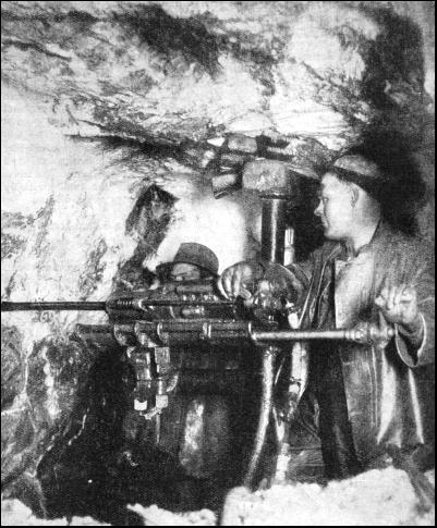 EXCAVATIONS for a railway, whether they involve boring through mountains and hills, or making cuttings in the open, are easily made when the medium encountered is soft ground. Even hard clay, shale, ground full of stones, boulders and soft rock are successfully overcome by the "big guns" or mechanical diggers, which dispose of them in vast quantities. When hard solid rock is met, as so often happens, the "big guns" have to retire and the "machine-guns" are brought up for action. By the "machine-guns" are meant the various types and sizes of rock drilling and boring machines. At first rock drills were worked by hand, wind, or steam, but attempts were made in 1850 to use compressed air as a driving power. In 1855 two compressed air drills made their appearance, and met with a measure of success. These drills were forerunners of the modern hammer drill, the compressed air being used to give a rapid succession of blows on the end of the borer. Compared with the modern rock drills these old machines were very' primitive affairs, but they marked a distinct advance on the older types. Their success when used on underground work made it evident that machine drilling by means of compressed air was a workable proposition, and could be effectively carried out. Thus, the compressed air drill began its career in rock tunnelling. The work of the earlier machines was more expensive than hand drilling, For instance, when the Mount Cenis Tunnel between France and Italy was being built the cost of machine drilling was double that of hand drilling, but the rate of progress was trebled. The rock drill was first employed for tunnel construction in America in the Hoosac Tunnel, where the "Burleigh" drills were brought into operation. These machines were so heavy, and the expense of repairs was so great, that they could not have been used at all without government assistance.