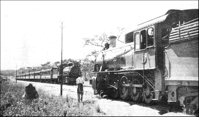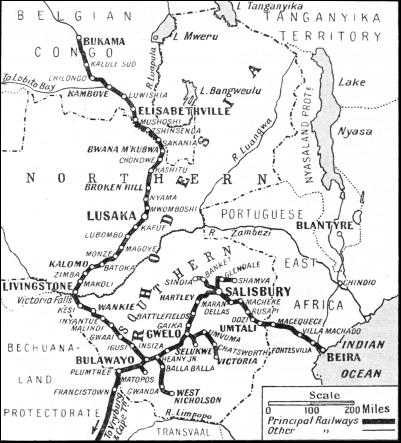 Leaving the town, the train descends in thirteen miles to Pasipas Siding, 4,178 ft., close to the west foot of the remarkable Pasipas Kopje. This hill of sandstone supplied the white, red, and pink freestone used in building Bulawayo. The stone has been sent to Salisbury, Mafeking. and Kimberley for building purposes, as it is equal to any quarried in South Africa or in Australia. Proceeding through other sidings the train reaches Nyamandhlovu Station, thirty-one miles, so named by the natives because it was "the place of the elephant'' in the old days when herds of wild elephants roamed this district. At Igusi Siding, fifty miles, the train passes through Gwaai Forest, the ant-proof timber (Igusi) being used for building purposes. The line drops to 3,341 ft. at Ngamo Siding, 107 miles, on the west of which is the Gwaai Native Reserve. Giraffes, elephants, and zebras are sometimes seen from the train. Intundhia, " the place of the giraffe," is a siding at 125 miles, and soon after this the train enters the Wankie district The native name "Wange" was the dynastic title of the Barotse chiefs of the tribe inhabiting the country. Malindi Siding, 147 miles, is a centre for big game hunters, Malindi meaning "the holes" (elephant pools). Some years ago a passenger train from the Victoria Falls was derailed by a herd of thirty elephants crossing the line. The engine was damaged and the cow-catcher was broken. A bull elephant killed in the collision measured 11 ft. 1 in. at the shoulder and had tusks 4 ft. long ; the skull is preserved at the siding. In the Wankie district other game includes eland and other similar species, lion, wild pig and giraffe and crocodiles. Wankie Station, 213 miles, at an altitude of 2,448 ft., lies in the centre of the coalfield. This important colliery area was opened up when the railway arrived in 1903. The mine had been developed from 1900, and directly the railway reached it, production expanded. Beyond Dcka Siding (221 miles) the line begins to climb out of the coal area. Matetsi Siding, 248 miles, is some distance east of Panda-ma-tenka. "props of the sky," so named because trees which were used for the centre poles for huts grew there. This place on the border of Bechuanaland and Rhodesia was at one time the only route to Barotseland, as all other routes were blocked by fly until the rinderpest of 1896 killed the game and the fly disappeared. The train now reaches Kesi Siding (3,489 ft.), fourteen miles from Victoria Falls, on the northern edge of the high land which now descends towards the Zambesi. Victoria Falls Station (2,994 ft.) is 280 miles from Bulawayo. The train proceeds over the great bridge at five miles an hour and on to Livingstone, seven miles distant. The town, the first administrative capital of Northern Rhodesia, was founded in 1905, and is complete even to an eighteen-hole golf course. The present capital is Lusaka, opened on May 28, 1935. After leaving Livingstone the train climbs through pretty country to the higher plateau land at an average altitude of about 4,000 ft. There is bush country as far as Kalomo, 374 miles from Bulawayo, beyond which is open veld. From Kalomo to the Congo Border the distance is 413 miles. The train crosses the 1,300-ft.-long Kafue Bridge, previously described, and winds through hilly, beautiful country up to the higher but flatter lands of Lusaka. Through well-wooded country it goes to Broken Hill, famous for its mines, and 4,000 ft. above sea-level. North from Broken Hill to the Congo Border, 133 miles, the line goes through mining country, Ndola being the last station in Rhodesia. The first station in the Belgian Congo is Sakania. whence the railway goes northwards to Elizabethville, the centre of the Katanga mining district, which is served by railways built to develop the vast copper resources. Branch lines serving various copper mines radiate from the main line at Ndola Station, in Rhodesia, and three through passenger trains run weekly in either direction over the main line to Livingstone. Also there are mixed trains with second-class and native accommodation, and a regular service is in operation for goods and mineral traffic