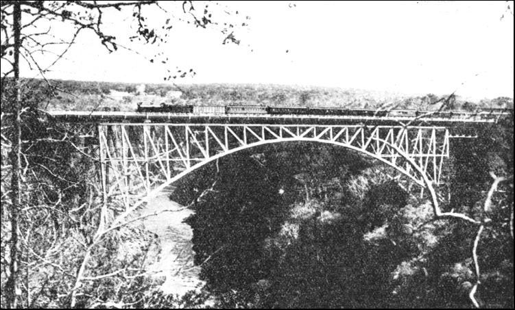 Meanwhile communication was being established with the port of Beira, which is the natural outlet for Rhodesia's trade. A narrow gauge line was built by the Beira Railway Company (which had been formed by the British South Africa Company) from Fontesvilla on the Pungue River, thirty-five and a half miles from Beira, to Umtali, on the eastern border of Southern Rhodesia. This line was begun in September, 1892, and completed in February, 1898. The Beira Junction Railway, connecting Fontesvilla with the port, was completed in October, 1896. This line from Umtali to the coast had a gauge of only 2 ft., whereas the gauge of the line from Umtali to Salisbury, built by the Mashonaland Railway Company, and completed in May, 1899, was 3 ft. 6 in. The inevitable result of difference in gauges followed when goods began to flow from Rhodesia to the coast. The line to Beira was therefore re-laid to the 3 ft. 6 in. gauge at a cost of about £800,000 for the 204 miles, the conversion being completed on August 1, 1900. About 1,000 white men and 6,000 natives were employed on the widening, which was effected without interruption of traffic. The new alignment shortened the total length by about twelve miles, without taking the track away from the settlements that had sprung up along the route. At first it was intended to take the main line northwards from Bulawayo through Gwelo, and more or less straight up to the southern end of Lake Tanganyika by the most direct route, as part of the Cape to Cairo plan. Work upon the extension to Gwelo was begun in June, 1899. In October, however, the Boer War broke out, and work was stopped, as materials and stores could not be obtained from the south. It was therefore decided to utilize the route to Beira by extending the line from Salisbury to meet the line coming up from the south, and the rails were linked at a point fifty miles cast of Bulawayo on October 6, 1902. Further exploration indicated very difficult and costly construction on the original "Cape to Cairo" route to the north. Moreover, important and valuable coal deposits near Wankie were discovered, and it was decided to abandon the original route and to take the line from Bulawayo north-west through Wankie and across the Victoria Falls. Wankie was reached in September, 1903. Rhodes had died in March, 1902, and the body of the Victorian imperialist was taken from a cottage on the shore near Cape Town to the burial place he had chosen in the Matopos, in the country which lie had founded and to which he had given his name. His associate, Alfred Beit, who died in July, 1906, left a large sum for the development of railways. Beyond the Wankie coalfield the railway engineers encountered the first serious physical difficulty—and one of such dimensions that it more than balanced the previous easy construction. The problem was nothing less than the Victoria Falls on the Zambesi River. The location of the line compelled a crossing of this mighty waterway just below the cataract, where the water, after tumbling over the ledge, is forced through a deep, narrow gorge 400 ft. deep.