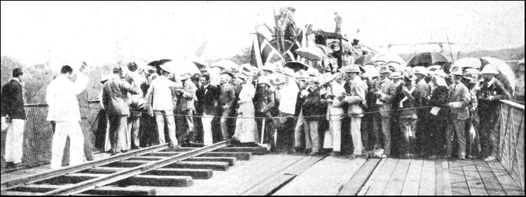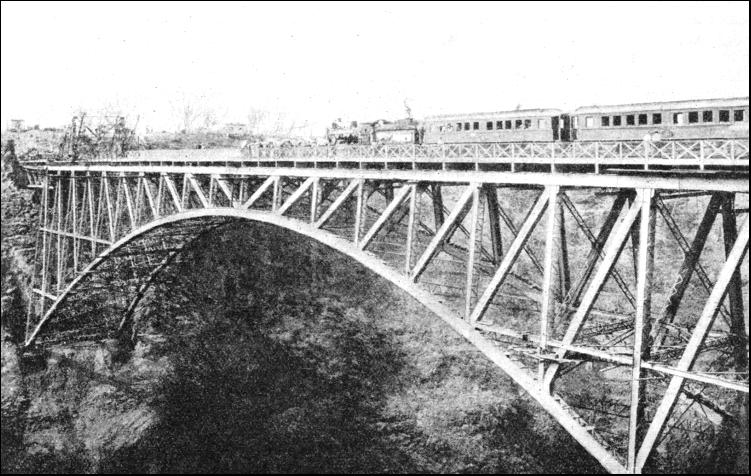 Dr. Livingstone discovered the Victoria Falls in 1855. They have not been brought about by any volcanic agency, but by a check to a deeper erosion of the bed of the river. This check is a resisting sheet of basalt about 200 miles wide, at an altitude of 2,900 ft. At one time the river was much higher and wider than it is now. It gradually cut a way down to the bare basalt. The original native name for the falls is "Shongwe," which means "boiling water in a pot." The falls are about two and a half times as high as those of Niagara, having a height of 420 ft. and a width of a mile and a quarter. In flood time the noise can be heard ten miles away, and the spray can be seen seventy miles away. The site selected for the railway bridge, just below the falls, is at the first arm of the gorge, some 200 yds. below the "Boiling Pot." Rhodes desired the bridge to be near the falls so that in flood time the spray would reach the carriage windows and impress the passengers; his wish was carried out. The walls of the gorge are almost sheer, and the surveys showed that the bridge would have to comprise a single span about 500 ft. long with the rails 420 ft. above low water. At the time it was built the bridge was the highest above water level in the world, but it has now relinquished its title in favour of the Fades Viaduct, in Puy de Dôme, France, the central 472-ft. span of which is 434 ft. above the Sioule River. The first difficulty was to establish communication with the opposite bank to avoid a detour of about ten miles. The two camps were pitched on the cliffs and a telephone wire was thrown across the gorge by means of a rocket. The rocket, with a length of thin string attached to the stick, was fired across the chasm. The opposite party secured the stick and the string, and by the string hauled across first a stouter length, and then one still stronger, and then the telephone wire. Before the rocket was fired, attempts had been made to fly a string across by means of a kite, but this ingenious effort was foiled by the eddies and currents of air from the tumultuous waters which tossed the kite in every direction but the right one. A second rocket was fired, and this time a marked wire was handed across, to measure the width of the gap, a spring balance being used at one end to calculate the sag of the wire. In this way the surveys were counterchecked. The bridge was designed by Mr. G. A. Hobson, and construction was begun by the Cleveland Engineering and Bridge Building Company of Darlington. The main span of 500 ft. is a graceful arch of steel. The total length of the bridge is 650 ft. At the sides the steelwork deepens to 105 ft., tapering in the centre to 15 ft. On either side the cliff-face was blasted out to provide the foundations for the main span. An overhead cable-way was slung across the gorge to enable the bridge to be built, and this was used to take men and materials from the south bank, to which they had been brought by the railway, across to the north bank. The workmen were carried in a little cage, and the few tourists who arrived made trips in this cage at ten shillings a head. A net was slung across the chasm under the bridge in the event of any workman slipping or dropping a tool. About eighteen months after work on the bridge had begun the first train crossed. The work had been done by natives, supervised by white foremen and engineers. In 1904, when the Victoria Bridge was being completed, the track to the north was being hurried on towards Kalomo. On this section, the engineer, Sir Charles Metcalfc, Bart., surprised a French railway engineer who asked him how many miles of track could be laid in a day. Sir Charles retaliated by asking his French guest to give an estimate, and the Frenchman said that he reckoned that half a mile a day would be a fair estimate. Sir Charles had a few words aside with the engineer in charge, and the engineer had a few words with the foremen, and the foremen had a few words with the native labourers.