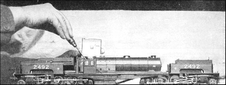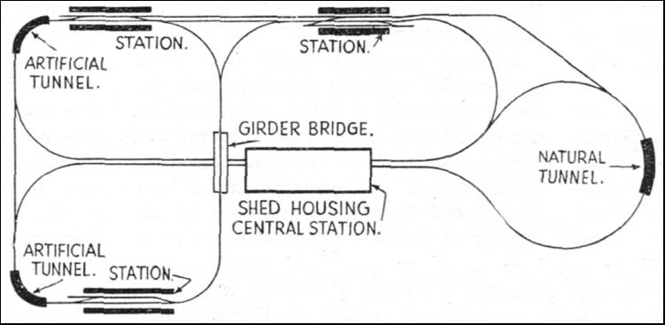 There are about 500 ft. of track laid on a foundation which is supported on concrete posts. A run of 400 ft. is covered by a train before it returns to the starting-point. This distance may be compared with the route mileage of a full-size railway. The line is laid with brass rails held with wooden keys in chair fastened to properly-proportioned sleepers. On one portion of the line the sleepers are nailed to longitudinal battens and on the other the sleepers are laid in ballast only. The lay-out, shown in the drawing below, consists of a central station which is housed in an asbestos building. There will be, eventually, three outdoor stations, as shown in the drawing. The making of additions, either to track or to equipment, constitutes one of the most fascinating aspects of model railway work. The trains can be made to take various routes as required, and will also, by means of spring-points, traverse the whole of the lines, finally returning to the starting point in the central station. The track is really a long single line, but is so arranged through the stations that the effect of an up-and-down line is obtained. Express trains passing through the stations give a most realistic effect, and films of the models shown on a cinema create the illusion of reality. The locomotive stud consists of eleven clockwork engines which are used by the junior "operatives" and twelve steam engines of both tender and tank varieties. Two are of the outside-fired "pot-boilered" type, three internally fired on the low-pressure system and three high-pressure-fired engines. The fuel used for each system is methylated spirit. Then there are three coal-fired engines, all of which are very interesting models. One is over twenty years old, and was the first engine of this size constructed by Mr. Harrison to burn coal ; it has worked successfully ever since. At one time it was the smallest engine in the world to burn coal. The second engine is a low-pressure coal-fired model with a satisfactory performance. The third is a model of the famous Great Western Railway engine, "City of Truro." This is a most successful engine, and it will run for over six minutes on about two teaspoonfuls of pea-size coal.