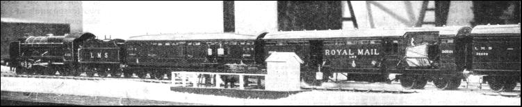 A particularly interesting model for public demonstration was built by Bassett-Lowke, Ltd., for the General Post Office. This model comprised a perfect working replica of an L.M.S. mail train. The track was built to the 1-3/4 in. gauge, and is 120 ft. long, with loops at either end for continuous running. The centre of the track is occupied by a station of modern design with the usual equipment, booking offices, waiting rooms, station-master's offices, bookstalls, notice-boards, and all those accessories that contribute to a realistic appearance. At two positions along the track scale-model wayside pick-up and delivery apparatus is fitted, which enables the model mail bags to be delivered and collected while the train is travelling at full speed. This operation has been reproduced in miniature down to the ringing of the bell automatically, as is the practice on the prototype. Two locomotives (one as a reserve) are used, the L.M.S. "Royal Scot" and "Black. Watch." Every external detail on the locomotives and coaches is faithfully reproduced to scale, and the whole train is operated electrically by means of a third conductor rail on a pressure of 20 volts. The model is controlled and operated from a signal box near the station, where the switches and resistance are housed. The signals are of standard upper-quadrant pattern.