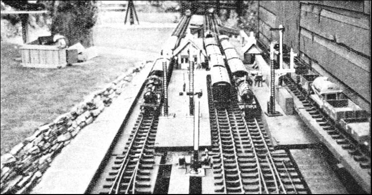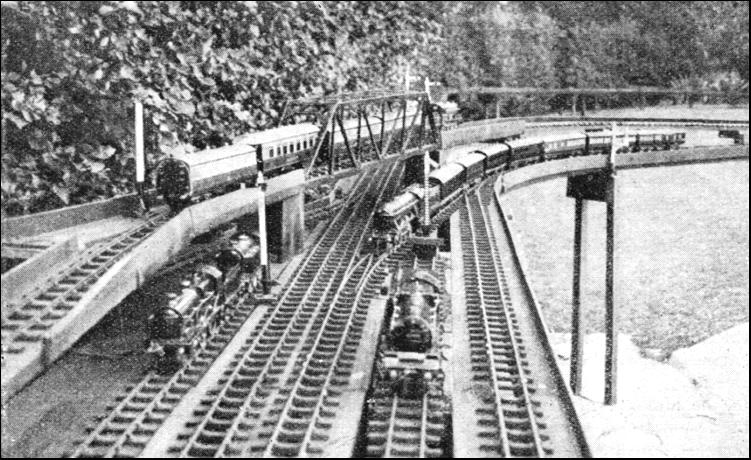 A typical outdoor Gauge 0 railway is that of Mr. Cecil J. Allen, which is so planned that it can be used, when necessary, by large numbers of boys bringing their own locomotives. For this reason it is raised up on trestles at an average height of 3 ft. for convenience in operating. The trestle structure is of considerable strength, so that the owner shall not feel unduly nervous if he sees a number of spectators all leaning up against the track at once. The uprights are wrought iron angles of the kind commonly used in fencing, of 1-1/2 in. square section and 3/16 in. thick, driven well into the ground in pairs. Timber cross-pieces of 4 in. by 2 in. section, set up on edge, connect them at the top ; above these are laid horizontal bearers of 4 in. by 3/4 in. section, to which the main longitudinals are attached. The latter are for the most part of timber, 6 ft. long and of from 1-3/4 in. to 2 in. square section. A pair is used to each track, spaced 1-1/2 in. apart, with the sleepers bridging the gap, an arrangement allowing for rapid and efficient drainage. Three longitudinals are used to carry a double track. From the main station, with its three platforms, the double main line is carried for some 70 ft. down the side of the garden, after which it bends round at 45 degrees into a second station with an island platform. From there, the two lines now converging to single track, the line curves back through 135 degrees to the far side of the garden, along which it returns for some distance, finally recrossing the garden diagonally back towards the main station. A complete circuit of the garden, from the main station back into the same station again, gives a run of roughly 200 ft. This can be completed without difficulty by a locomotive with a good modern clockwork mechanism, hauling a train of reasonable size, on the scale model permanent way with which the whole of the track—now well over 400 ft., in total extent—has been laid. A special point has been made of spacing the sleepers only 1-1/2 in apart. Although involving the use of more sleepers and chairs, this adds considerably to the realistic appearance of the line.