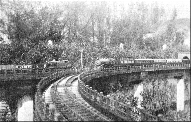 All these features are faithfully reproduced in the model, and even the smallest accessory is beautifully finished. The kitchen has a scale model stove and sink, and the dining-room has yellow silk curtains and blue pile carpet, polished table and six chairs of finest teak, and easy chairs and sofa upholstered in blue leather. Each sleeping compartment is equipped with a scale model writing-table, wardrobe, beds, and a special metal rack, and the bathrooms contain showers in addition to the usual bath, wash-basin and other fittings. Each compartment is lit by special white electric globes, and has an exhaust fan to keep the room cool. The exterior is finished in cream with gold lines, with a grey roof. The glass windows are protected by two shutters—a mosquito shutter and an ordinary wooden shutter. The model is cut away to show every detail. Models of railway prototypes are used extensively in the film industry. It is an expensive business to run a full-sized train over a smashed bridge into a ravine. A model can portray this part of a film just as well—and clever photography does the rest. The models must, however, be perfect in every detail, as the camera picks out any fault in design and workmanship and magnifies it. A good photograph is, in fact, a recognized test for perfect modelling. Models have played an important part in many famous films with a railway interest. For the filming of "Rome Express" a magnificent model of a P.L.M. Pacific locomotive was built by Messrs. Bond's of Euston Road, Ltd., to a scale of 1 in. to the foot. Railway models of all kinds may be seen at the Science Museum, South Kensington, and other educational centres. Demonstration models of locomotives, trains and railway equipment are in constant use by railway companies for instructional purposes, and are employed by other bodies for publicity.