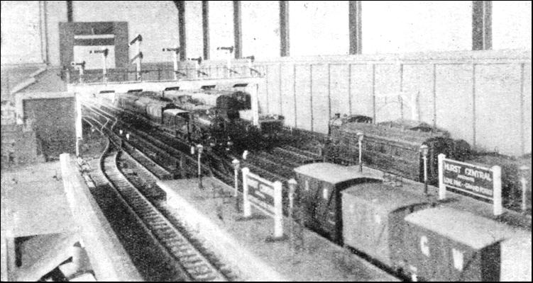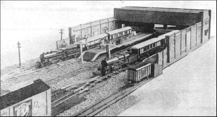 There are seven stations, comprising nineteen platforms, complete with signals, bridges, and the usual equipment to be found on modern railway premises All repairs and track laying are carried out by Mr. Webb and Mr. Rather, and they have made a large number of the coaches and trucks. This railway, in common with most model systems run as a hobby, is constantly being added to, and considerable time is spent in effecting improvements to the various details. The electrically-driven engines (which have been purchased) pick up current from an outside third rail as used on the Southern Railway's electrified system. There are about twenty-four engines in use on the railway, and the rolling-stock comprises nearly 200 coaches and wagons. Of these, fifty-six are scale models of express passenger stock, twenty are suburban carriages, and the remainder various types of goods wagons. The railway is run, as far as possible, in accordance with "big practice," and there are the usual down and up roads with local and main lines.
