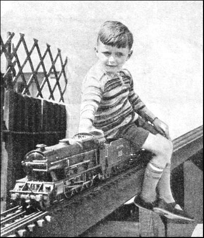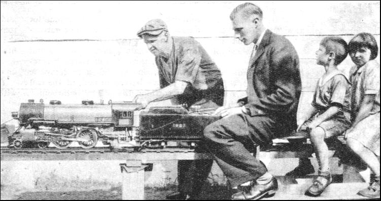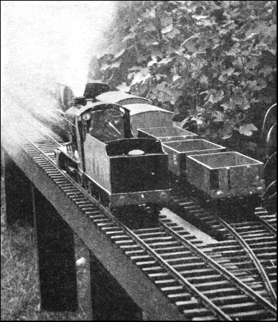 Miniature locomotives for passenger hauling may be purchased commercially, but these are somewhat expensive and many garden railway owners prefer to build their own locomotives. Castings and materials are readily obtainable, and many amateur engineers have built some excellent machines with simple workshop equipment. The post of driver is combined with that of fireman on miniature lines, but the duties of the "crew" on a little locomotive are exactly the same as on a big engine. Steam is controlled by means of the locomotive regulator, reversing and "notching-up" are accomplished by a lever and quadrant, or by wheel and screw ; the water gauge must be watched and the boiler replenished as necessary, and firing must be done regularly and methodically by means of a small shovel. The shovel blade for a 2-1/2 in. gauge engine is only about 2 in. long and 1/2 in. wide. Some owners of garden lines, who wish to operate them by electricity, have laid a third rail, supplying current at 12 to 20 volts, obtained through a transformer from the house mains. A small fractional horse-power motor is sufficient for passenger hauling on a level track. Had it not been for the development of the miniature steam locomotive, it is safe to assume that there would have been no very small garden railways, carrying live loads, in existence at the present time : and it is only in recent years that such lines have come into existence. Not many years ago, a 2-1/2 in. gauge locomotive which burnt coal and hauled a train of twelve coaches was considered somewhat of a marvel. This ran on a 2-1/2 in. gauge railway erected on a wooden trestle about 60 ft. long, in a back garden at Norbury, Surrey.