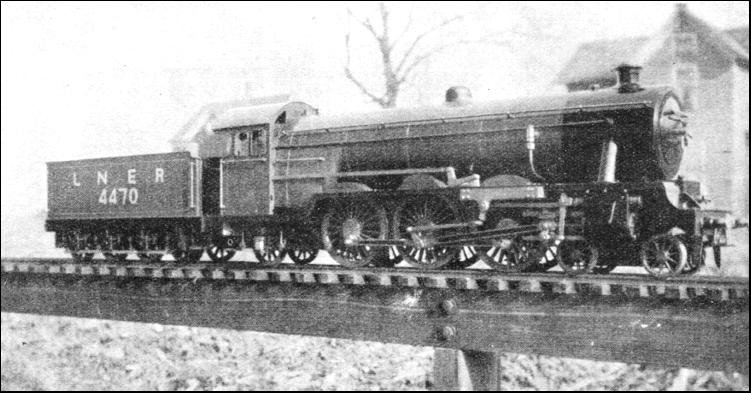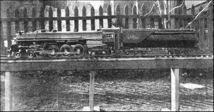 Alongside the main station is a garden shed, and this has now been used for the provision of additional trackage under cover. Inside this there are two stations, one low level, at the same height as the main system, which is level throughout, and the other a high level station immediately above. The high level line emerges from the shed, and after a short straight run, swings over the main line by a skew girder bridge, of which the equivalent span in full size would be about 150 ft.; it then descends on a gradient of about 1 in 33, to join the line coming across from the far side of the garden. Outside the shed a connexion has been laid down from the high level, past the main station, to join the sidings at the inward end. This thus serves to provide a fly-over line, and is useful as a means of releasing the locomotives when all the platforms at the main station are occupied by incoming trains. Ample siding room is provided at either end of this station. The stock of model clockwork locomotives includes a "Flying Scotsman" type L.N.E.R. "Pacific," which in one of the illustrations can be seen running on to the main line after having come across the garden ; a "Royal Scot" of the L.M.S., which is the fastest and most powerful engine on the line, and has succeeded in hauling a train of fifteen bogie coaches without assistance ; a Midland compound 4-4-0 and a "George the Fifth" 4-4-0 of the L.M.S., and a "Shire" class 4-4-0 of the L.N.E.R. In addition there are free-lance 4-4-0 and 0-6-0 tender locomotives, a very powerful 0-6-0 tank, and an 0-4-0 locomotive. In addition to the foregoing locomotives there is also a 4-4-0 steam locomotive, but the use of externally-fired steam engines out-of-doors is necessarily limited to windless days. A variety of passenger coaches and freight stock is in use.