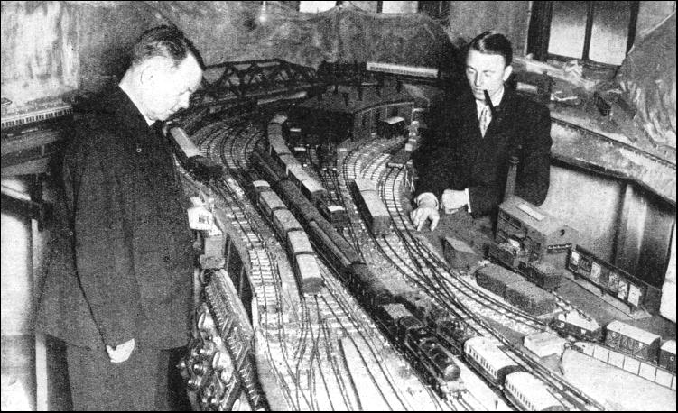 The rolling-stock is fitted with a special hook and loop coupling device, operated by ramps placed at various points on the track, so that trains can be assembled or divided without touching by hand. The running rails are of rustless steel carried in chairs spiked to the sleepers. The centre live rail is of brass and supplies current to the locomotives through sliding contacts. Track is ballasted with fine slag chippings. The motors of all locomotives are fitted with permanent magnets which, by reversing the poles on the controller, allow of forward or reverse movement of the train. A pick-up apparatus for Post Office mails forms part of the track equipment, and a postal van attached to the trains enables mail bags to be picked up while travelling at speed. All locomotives, rolling-stock, bridges, tunnels, stations, and engine sheds are built to a scale of 7 mm. to the foot. Another very fine indoor railway, built to the 0 gauge, is that owned by the Rev. A. H. Webb. This line occupies a very considerable space in its owner's vicarage and represents many years' work by the Vicar and Mr. G. Rather, who has designed most of the lay-out and equipment. ' The railway has over 2,000 ft. of track, more than a hundred points, and is electrically operated throughout. Current obtained from the house mains is transformed down to a pressure of eight volts. To work the system at its full capacity it is necessary to have four people stationed at control switchboards placed alongside the track. The railway is raised to table height for convenience, and great care has been taken with the scenic effects, which include a large number of tunnels and bridges, sheds, and sidings.