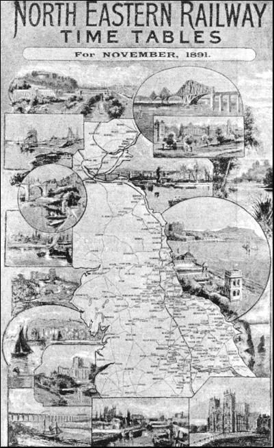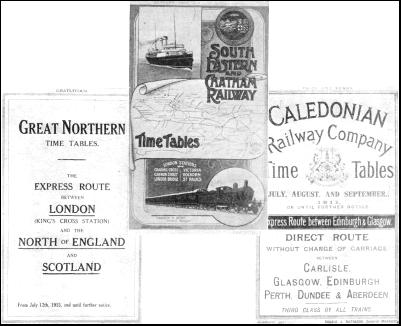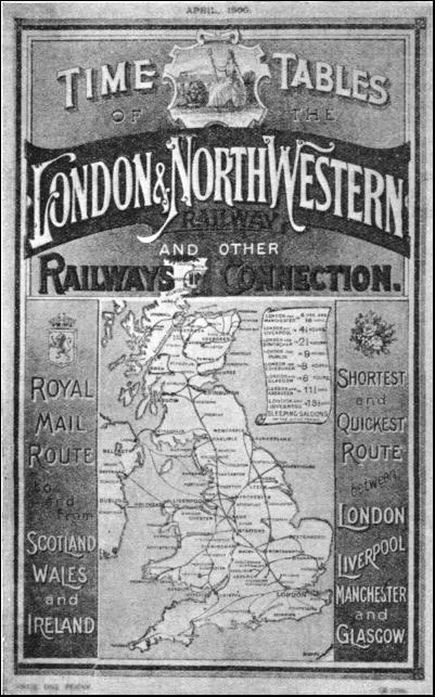 Further, the covers of some of the old time-tables were works of art. The Great Western time-table for July, August, and September, 1889, is a fine example of the style of the period. In the centre is an engraving of Windsor, flanked by views of Cardiff on the left and of Salisbury on the right. Above Windsor Castle is a glimpse of Plymouth, with Gloucester and Worcester cathedrals on either side. Below are Tintern (Mon.) and Llangollen (Denbighshire), supporting a view of Mumbles Lighthouse, South Wales. The colour scheme is brown, black, and white, which is much more pleasing than might be expected. In this connexion it may be noted that the Great Western is the only pre-grouping railway to retain its identity. The North Eastern time-table for November, 1891, in black and white, shows a map of the system surrounded by views of Edinburgh, South Shields, Knaresborough, Hull, Barnard Castle, Whitby, Fountains Abbey, and Berwick on the left, and of the Forth Bridge, Harrogate, Newcastle, Durham, Scarborough, Flamborough Cliff, and York Minster (adjoined by York) on the right. The inclusion of Edinburgh and the Forth Bridge—the latter then only eighteen months old—must be regarded as an example of intelligent anticipation rather than as a presentation of the facts, since, though they were on the East Coast route, of which the North Eastern was an active partner, they were within the domain of the North British Railway. The London and North Western time-table tor April, 1900, introduced scarlet and blue-green into the general scheme of black and white. The railway lines on the map, the "Railways in Connection," and the background of "London and North Western Railway" are scarlet. The sea in the map is blue-green. Of particular interest is the scroll showing the fastest times of that period between London and Manchester, Liverpool, Birmingham, Dublin, Edinburgh, Glasgow, Aberdeen, and Inverness. This type of London and North Western time-table is probably the most attractive ever issued by the "premier railway." A few years before the war of 1914-18 the London and North Western, following the lead of the Midland, which introduced a severely plain red cover in the style popular to-day, brought out an imitation in chocolate and white. The South Eastern and Chatham time-table for "October, 1911, and until further notice," is a successful effort in many colours. The cross-Channel steamer in the top left corner and the express train at the bottom are particularly attractive. A contrast is provided by the plain Caledonian time-table for July, August, and September, 1911. Here the background is white, and the lettering dark blue, the colour of the Caledonian locomotives. The only ornament is the coat of arms in the centre. Still plainer is the rare war-time time-table of the Great Northern Railway "from July 12th, 1915, and until further notice." This has a buff cover and brown lettering. As the war progressed, the railways gradually gave up issuing public time-books, though small folders were to be had. The train services gradually deteriorated as the war years went on, reaching their nadir in 1918. From that date a gradual recovery set in. To-day the train services are, with few exceptions, far better than they were before the war.