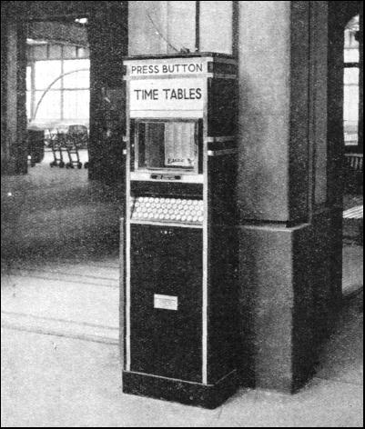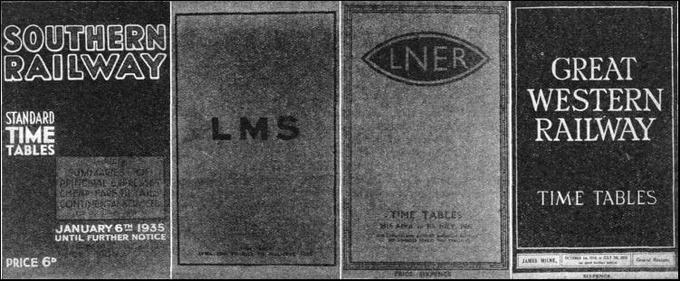 The latest form of station time-table is the "Mechanical Information." This machine has a keyboard and an illuminated window. The intending passenger selects his destination from a numbered list of stations, and presses the appropriate key, when the desired time-sheet appears in the window. When there were dozens of railway companies, each of them issuing its own timetable, the collector of railway literature was able to garner a rich harvest. Since 1923, when the Railways Act reduced the number of main line companies to four, the timetables were reduced in number accordingly. The L. M. S., L. N. E. R., Great Western Railway, and Southern Railway each publish at intervals during the year a weighty volume detailing the relevant train services. There are always a "summer" and a "winter" time-table, the word "summer" meaning in this connexion a period of ten weeks or so in July, August, and September, and "winter" the rest of the year. Some railway's issue "spring" time-tables as well, dating from about May 1. The time-tables of the L.M.S., L.N.E.R., and Great Western Railway each measure about 11-1/2 by 7-1/2 inches. The Southern time-table is a reprint of the relevant section of Bradshaw, suitably enlarged with pages referring to its own activities. Its size is 6-1/2 in. by 5 in. The L.M.S. book is the bulkiest, as befits the largest railway, running to 592 pages more or less. The L.N.E.R. requires 426 and the Great Western 268 pages. The covers are severely plain, and directly or by suggestion reflect the colours of the passenger carriages belonging to the respective companies. Thus, the L.M.S. cover is mainly red, the L.N.E.R. cover mainly orange, suggesting the varnished teak of the L.N.E.R. carriages ; the Great Western cover is "cold tea and cream," and the Southern cover mainly green. All the four time-tables are equipped with excellent maps of the systems concerned. Each is priced at sixpence. In addition the L.M.S. and L.N.E.R. issue suburban time-tables, naturally of much smaller dimensions. There are also the time-tables of the London Passenger Transport Board, embracing the former Metropolitan, Metropolitan District, and London Electric Railways. But these time-tables include also the motor-bus, coach, and tramway undertakings included in London Transport. The few surviving small railways usually issue their own time-sheets. The modern public time-table differs in many ways from its predecessor. The time-table of thirty or forty years ago was published more frequently. For many years, for example, the London and North Western Railway issued one every month. The usual price was one penny, though some timetables were marked "gratuitous," for distribution to certain favoured organizations. A penny time-table of a pre-grouping railway was not, however, as good value for money as a sixpenny post-grouping time-table, since a railway of the. size of the L.M.S. has absorbed far more than six railways.