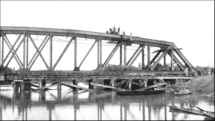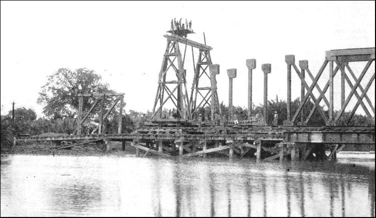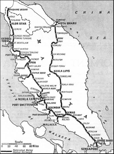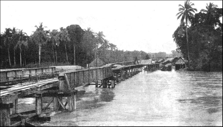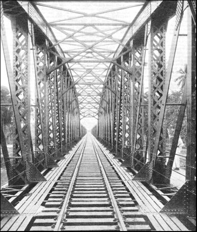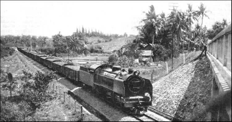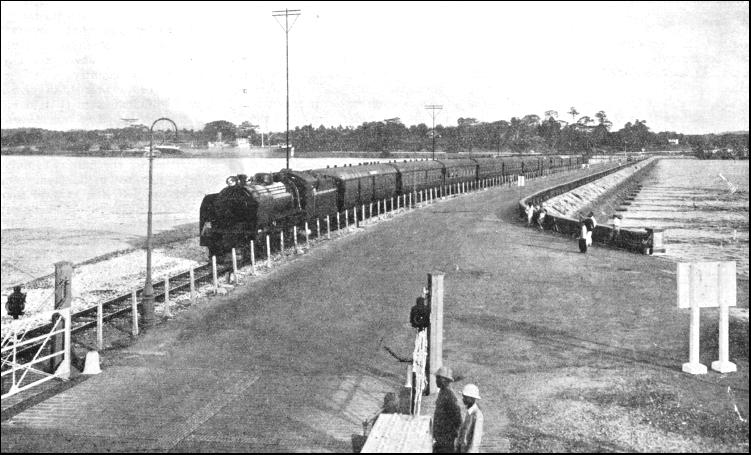 By keeping near to the river the engineers were able to round the Tahan Mountains on the east, and obtained not only a much shorter road than would have ensued had the western turning of the mountain been adopted, but also one which was considerably cheaper and more economical to lay. The section north from Tembeling to Kuala Lipis, 141 miles, was opened in 1917. This part of the line followed the river and involved at one point the construction of a retaining wall 400 ft. in length and a viaduct of three brick arches. To the north, in Kelantan, thirty-two miles were opened in 1915 from Tumpat southward to Tanah Merah. The war of 1914-18 hindered the construction, work on the northern section being stopped for more than three years. Soon after the war the resumption of work was hampered by trade depression, and it was not until 1921 that a further stretch of five miles of track was added to the southern section, which was creeping up northward from Kuala Lipis, the new railhead being at Padang Tungku. The engineers working southward reached the Kelantan River, thirty-five miles from Tumpat, and work on the building of the Guillemard Bridge was begun in 1920. This bridge, which was opened in July, 1924, was the largest in the Peninsula, being 2,166 ft. long over all, and composed of five clear spans of 250 ft. each and five spans of 150 ft. The height from the river bed to the underside of the girders is 55 ft. The quantity of concrete and brickwork in abutments and piers is about 20,000 cubic yards, and the total weight of steelwork in the girders is 2,776 tons. As the work proceeded in this Kelantan section a number of tunnels had to be constructed. Progress during the years was in accordance with the money allocated out of the resources of the Peninsula. It was not until September, 1931, that the East Coast Line was opened to traffic, the last section to be completed being that between Gua Musang (200 miles from Gemas) and Kuala Gris, in Kelantan. A through service was begun, an express leaving Tumpat, the northern terminus, every Thursday morning, with day and night accommodation, and reaching Singapore the next morning, the journey occupying twenty and a half hours. The express in the reverse direction leaves Singapore on Sunday evening, and arrives at Tumpat on Monday afternoon. Mixed trains (passengers and goods) run in addition. At the end of the year, in December, the Peel Bridge at Kemubu, 235-1/2 miles from Gemas, collapsed because of the abnormal rise of the river. The bridge consisted of two main spans of 250 ft. each and a land span of 150 ft. The river, after having begun to rise at the rate of 10 in. an hour, reached the girders, and the rise then increased to 18 in. an hour, the water flooding the railway track to a depth of 9 ft. All the time the rain-swollen current was sweeping down at the rate of ten knots, pounding timber and logs against the steel work. The bridge became a dam against which all the trees and matter brought down by the river piled up hour after hour. To the anxious onlookers it seemed incredible that the bridge should hold. The flood water reached the bottom boom of the bridge in the afternoon at 3.30 on December 18, and more than seven hours later the bridge was still intact despite the fact that something like twelve acres of trees and logs were jammed against it by the terrific force of the water. About 11 p.m., however, the two 250-ft. spans gave way, the lateral pressure against the girders being overwhelming. Apart from the work of rebuilding the bridge, the line was badly damaged at many points, and the cost of reconstruction was more than £70,000. The engineers and administrative officers had a busy Christmas. The line was closed for only a few days, as it was imperative to get food through to the regions devastated by the floods. A train was sent out on December 22 from Kuala Lipis, in Pahang, under orders to go north as far as possible. This was forced back by the floods. A railway tug and a lighter were then sent from Kota Bahru up the swollen River Kelantan to Krai with food for the suffering natives. By Boxing Day the railway officials at Kuala Lipis had got into operation a temporary train service to Gua Masang, while their colleagues more than 130 miles to the north at Krai, in Kelantan, were stretching out a temporary service to the south. Some very fine work was done to relieve distress during this period of flood. It was not until months had passed, in April, 1932, that the East Coast Line was reopened throughout its entire length. While the East Coast Line at the northern end of the Peninsula was being repaired and consolidated in 1932, important developments were being completed at the southern end, on the island of Singapore, this work being the consummation of a programme which had been in hand for some three years. When in June, 1932, the Governor of the Straits Settlements, Sir Cecil Clementi, opened the new terminal station at Singapore, he said that he stood at the end of a chain of railways which would one day form a continuous line of permanent way from the Strait of Dover through Europe, Turkey, Mesopotamia, Persia, Baluchistan, India, Assam, Burma, Siam and Malaya to where he stood. The missing links in the chain are from Prachuah in Siam to Ye, the Siamese end of the Burma system, between Burma and Assam, between Baluchistan and Basra (Iraq), between Mosul (Iraq) and Aleppo (Syria), and the ferry across the Bosphorous, between Asiatic and European Turkey.
