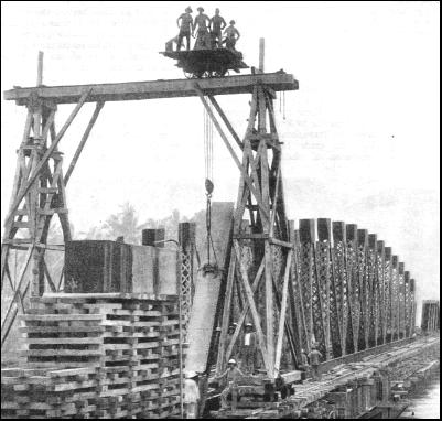 Once the main line from Prai to Johore Bharu was completed, the railway builders turned their attention to the northern part of the Peninsula to carry out the project of linking up with the railways of Siam. The line from Prai was picked up at Bukit Mertajam, which is about seven miles from the port, and was advanced northward into the State of Kedah, reaching the capital, Alor Star, in 1915—sixty-three miles from Prai. The engineers pressed forward, carried the line into the State of Perlis, and proceeded to the northern frontier of the Federated Malay States at Padang Besar, which is 105 miles from Prai. Here the line joined that of the same metre gauge which had been brought down through Siam, thus providing a line linking Bankgok with Singapore. Before the rails met, the alert authorities had visualized the effect the junction would have on sea-borne traffic. It was not economic to move Siamese traffic to or from Singapore, or even Port Swettenham, if a more suitable shipping point nearer the Siamese border, and available for ocean-going vessel, could be found. The obvious port was Prai, but in its condition at that period the port needed improvements. The chief engineer and general manager of the railway therefore recommended a comprehensive scheme of development which would enable large ships to berth alongside the wharves and load and unload into railway wagons direct or into transit sheds. In 1914, before the rails of British Malaya had met those of Siam, the Malayan authorities had decided to adopt this plan. But the outbreak of war delayed the beginning. In 1917, however, when extensive dock works had been completed at Singapore, the plant used for this work was released; so the contractors brought it north to Prai and the work began in May, 1918. The work included the construction of a reinforced concrete jetty, 1,100 ft. in length, at the mouth of the river ; the continuation upstream of the existing wharf for 600 ft., and beyond a coal wharf 900 ft. long—a total wharf frontage of 2,600 ft., with a minimum depth of 30 ft. of water for vessels alongside. Work also included a lighter basin 1,100 ft. long with a minimum depth of water of 16 ft. ; dredging and deepening the main channel and approaches to a depth of 30 ft. and a width of 500 ft. ; and, finally, the reclamation of nearly 200 acres of swamp, fringing the river, with the foreshore. As little was known of the site before the coming of the railway, exhaustive surveys and borings were essential. The river-bed was the critical factor, and this was found to comprise a thick layer of mud upon an extensive stratum of sand, encountered at an average depth of about 55 ft. below low water. The depth of this underlying sand remained problematical until 1917, when it was found to extend downwards for 270 ft. under the silt—315 ft. below low water—to be of varying degree of coarseness, and to rest upon a hard, igneous rock. It was decided to use the sand as the foundations for the wharves and jetty, and a specially massive design of ferroconcrete structure, supported on concrete cylinders sunk through the mud, was adopted. The cylinders, with an external diameter of 8 ft. 6 in., are set in forty-five rows, spaced 25 ft. apart, centre to centre, with seven cylinders to each row, and spaced 22 ft. apart, centre to centre, over a depth of 142 ft. These support the heavy ferro-concrete superstructure forming the deck of the wharf and jetty. On this are carried the cranes for loading and unloading vessels, the sidings of the railway with a turntable at either end, and the usual additional mechanical handling appliances.