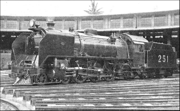 When the constructional engineers set off to follow the line of stakes they were also handicapped by the lack of transport facilities. They made roads, and corduroyed them repeatedly, to support the heavier traffic between the camps. The heavy atmosphere in the depths of the forest was exhausting to the white men. The torrential rain hampered movement, and caused the rivers to overflow. Swamps, which could not be avoided but had to be crossed, swallowed spoil and ballast greedily. The labour of cutting the timber to make the track through the jungle was heavy. The density of the jungle, and the speed with which vegetation grew, made it essential to cut a swathe 100 ft. wide on either side of the single track. Most of the trees were not of soft wood, but were hard-grained, some being of large girth. These trees provided plenty of work for the lumbermen, and they were turned to use. The trunks provided material for construction. The best timber was set aside to be taken to the railway shops to be used for building rolling-stock ; the shorter, thick odds and ends of logs were stacked in piles to serve as fuel for the locomotives ; while branches and trees which were of inferior wood were used for corduroying the roads. The clearing of the right of way was thus profitable, very little of the felled timber having to be disposed of by burning. When the soil was laid bare, the railway builders found that the outlook was not attractive. The ground was streaked with rotten laterite, decayed granite and sandy clay, and was thoroughly saturated. When an embankment was raised the problem was to keep it in position, or safeguard it against obliteration by a landslide. So unstable was the soil that rain would set up an earth movement. The right of way was, therefore, made wider than usual to secure protection against disruption, and effective draining proved the best safeguard against landslips and subsidences in the embankment. Lallang grass was planted on the slopes, because the fibrous roots tend to bind the unstable earth and keep it in place. The rivers and streams are numerous, and, after a heavy rain they change from insignificant waterways to menacing torrents. Culverts sufficed for the creeks, although they had to be introduced freely, averaging about four to the mile, but the larger streams had to be bridged. As far as possible bridges are standardized throughout the Peninsula with spans of 100 ft. and 150 ft., so that the longer bridges are multiples of these two units. On the section from Johore Bharu to Seremban forty-nine bridges, of which nineteen exceed 100 ft. in length, were set up. The heaviest work was encountered in crossing the Muar and Segamat rivers, the Muar requiring a bridge of five spans, and the Segamat one of three spans. Other streams were crossed by single or double-span bridges. At formation level the road, although the track is of the metre gauge, was built to be adequate for the standard gauge of 4 ft. 8-1/2 in. should the change ever be necessary. The ruling gradient is 1 in 100, with minimum curvature of 1,910 ft. radius, to ensure economy in haulage and train speeds of up to forty miles an hour. Since the main line track was laid with 80 lb. rails, it was, when it was opened for traffic, the heaviest metre gauge track in the world, operating the largest rolling-stock and heaviest locomotives built to that gauge. The locomotives weighed nearly 75 tons in working trim, and were 57 ft. 11 in. in length over buffers. They had cylinders 15-1/2 by 24 in., working at 180 lb., and driving wheels of 4 ft. 6 in. diameter.