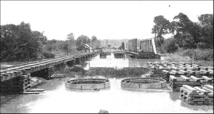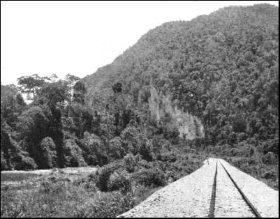 The construction of the East Coast line cutting diagonally across the Peninsula from Gemas was difficult, because of the obstacle of the mountains. The pathfinders tried to obtain a line that would conform in gradient and curves with the lines already built, but the quest was tantalizing. In accordance with general practice, the surveyors endeavoured to turn the courses of the streams to account. They followed one river here, crossed another there, and picked up another elsewhere, as far as the watershed, and then followed a similar practice down the opposite slope. In this manner the surveyors brought back proposed locations conforming to the general scheme of the railways—no gradient steeper than 1 in 100, and no curve of sharper radius than 1,910 ft. In the search for an easy gradient, the first trial line was run from Gemas Station up the valleys of the Muar and Serting rivers for thirty-two miles. Then it struck almost due north, crossing the Triang River, to pick up the Pahang River, to which it clung for six miles to the junction of the Semantan and Pahang rivers at Temerloh. But this line had the disadvantage of requiring heavy development work between the fourteenth and twenty-fifth mile-posts, so an alternative line was driven. This avoided tunnelling, but introduced sharper curves to round the spurs thrusting themselves upon the Muar River, and also heavy bridging, although the gradient was maintained. Also, the deviation increased the length of the line by two miles. Although this second route would have cost nearly £10,000 a mile it was cheaper than the first. Further consideration of the surveys induced the chief resident engineer, in charge of work in the field, to try to find a third route. He instructed the surveyors to explore the lie of the land farther to the east, with the result that a third and superior line was adopted. This abandons the original alinement altogether upon leaving Gemas Station, bearing more to the north, and crossing the Muar River near the sixth mile-post. After leaving the river it swings towards it and then turns away again. At the twenty-third mile it crosses the Bahau and Serting rivers, and the Triang River at mile 55-1/2. The Pahang River is approached, but not crossed, and at Temerloh, seventy and a half miles from Gemas, the temporary railhead was planted. This location reduced the mileage by about eight miles, eliminated all heavy work, and pulled the costs down to £7,990 per mile, inclusive of rolling-stock. The surveyors found the country sparsely populated. Two miles from Gemas they discovered a small native village, or kampong, of about forty people, engaged in the breeding of buffaloes, the cultivation of rice, and the collection of jungle produce which they exported by means of the river. Small settlements were discovered at intervals up to Rompin, where the surveyors found a Malay village of seventy inhabitants. Throughout the next few miles only a few isolated huts were seen, these being occupied by Sakais, the aborigines, who eke out a living by cultivating maize and yams. Bahau was only a small Malay kampong ; but from a point two miles beyond, to Kuala Pilah, the country was fairly well populated by Malays. One stretch of country, thirty-five miles in length, was practically devoid of human life, only Sakais being met at intervals. Near the Triang River the Malays were numerous, as they were when the Pahang River was approached. For about two-thirds of the distance the alinement ran through virgin jungle that yielded very little serviceable timber, the trees rarely exceeding 2 ft. in diameter. Plenty of coarse sand, suitable for ballasting and mortar, as well as a clay for making bricks, was found along the route. From Temerloh, the next stage northward was to Kuala Tembeling, 117 miles. This section is roughly parallel with the Pahang River, which flows into the China Sea, and the line was set back so that a fairly straight alinement, avoiding the windings of the river, was presented. The country traversed was practically uninhabited virgin jungle. There were settlements on the banks of the river, the highway of the natives, but these did not penetrate the forest to any distance. This population became more scanty as the railway pushed northwards, the villages being very small and infrequent, and peopled by natives of an inferior type. There was no sign of any industrial activity along this length of the line.