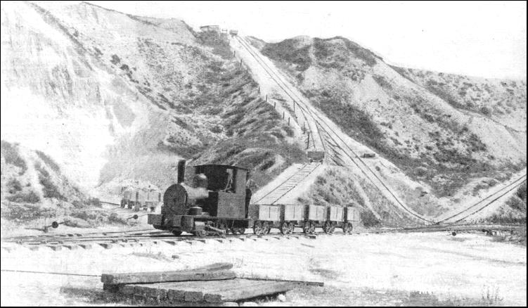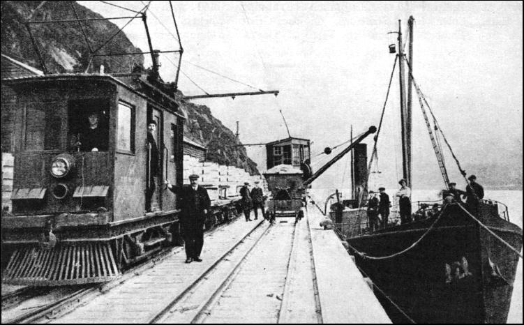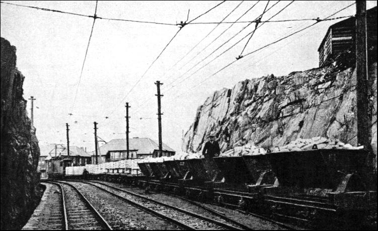 Punctual and efficient working is ensured by an elaborate organization that is comparable, even if only on a small scale, with that of a main-line railway. This involves the compilation of a number of forms and returns, some of which are of a specialized nature. These include empty wagon requisitions, loading slips to foremen ale loaders, daily statements of forwarding at each of the breweries, daily returns of wagons standing under load, and "Due Away Loaded" cards. The loading slips give particulars of each consignment, together with its destination, loading times, particulars of the place where the consignment is to be found in the store-rooms, and various other details. Instructions to loaders are drawn up in advance by the invoicing and forwarding department and distributed by the traffic department, which keeps in constant touch not only with all the brewery departments but also with the L.M.S. and L.N.E.R. Another great brewery railway is the system owned by Messrs. Guinness at Dublin, which includes both narrow-gauge and main exchange lines. Great quarries form the situations of many very remarkable railways, and one of the most noteworthy in the British Isles is the system in operation at the great Dinorwic slate quarries near Llanberis. in North Wales. This is really not so much a system as a series of systems, for a huge mountain-side of solid slate has been cut into terraces, one above the other, and each terrace has its own particular railway line. Slate has been quarried at Dinorwic for centuries, and rail transport has been in use there for more than a hundred years. On each of the terraces of the quarry a little 1 ft. 11-1/2 in. gauge serves the working face, the track being portable to facilitate rapid alteration to the layout as the workings change. Small tank engines provide the motive power. These weigh about six tons apiece, and can be moved from terrace to terrace by means of inclined planes, which are also regularly used for the transfer, by cable, of the slate trucks between terrace and ground level. From the transfer planes, a 4-ft. gauge line leads away across country to the transhipment point at Port Dinorwic on the coast. At Port Dinorwic another inclined plane leads down to the quays on a gradient of 1 in 4. The method of conveying the slates from the working faces to the coast is peculiar. Loaded up on to the 1 ft. 11-1/2 in. gauge trucks, the fragile freight is transferred by means of the first plane to the 4-ft. gauge line. Here, instead of the slates being unloaded and loaded again, a proceeding which would greatly increase the risk of breakages, the small trucks are loaded bodily on to the 4-ft. gauge wagons. A six-coupled side tank engine, weighing about twenty-five tons, is then attached and the load moves off along the seven-miles-long "main line" to Port Dinorwic, where the inclined plane transfer process is repeated, thus eliminating transhipment during the overland part of the journey. This line, known as the Padarn Railway, is not open to the public, but passenger trains are run over it purely for the benefit of the many hundreds of men engaged on work in the quarries. Another remarkable Welsh quarry railway is that on the Penmaenmawr Mountain, Caernarvonshire. Here again the inclined plane system is well exemplified. Visitors to Cornwall, too, will find a noteworthy example of the plane and terrace system at work in the vast slate quarries at Delabole, close to the most westerly section of the Southern Railway, from which they are clearly visible. The Delabole quarries have been worked since Elizabethan days, and probably earlier.