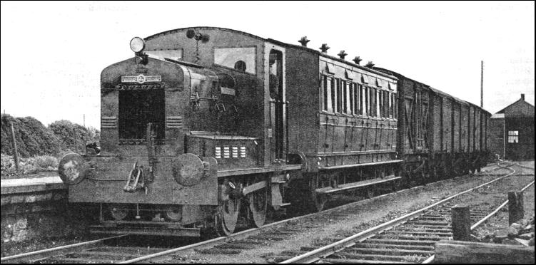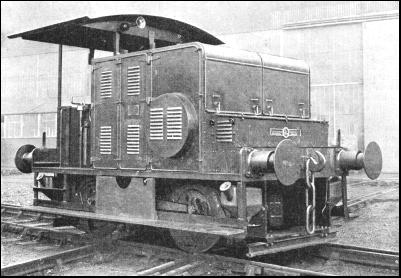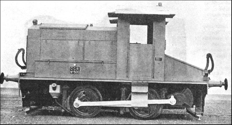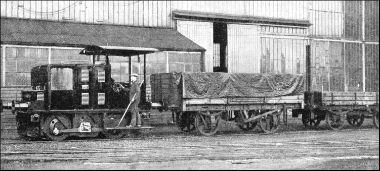 The water employed to cool the cylinder heads and barrels is in its turn cooled by means of a radiator, or radiators, placed in front so as to obtain the maximum cooling effect. A belt-driven four-bladed fan is usually arranged behind the radiator, as in motorcar practice. When the locomotive is working at low speeds or with a following wind, the cooling fan becomes a necessity—otherwise the water in the radiator would probably boil. The controls sometimes appear to be more complicated than those of the steam locomotive—and in some instances it must be admitted that they are. But in the larger locomotives employing hydraulic or electric transmission they are much simpler. There are, for example, no clutch to operate and no gears to change ; neither is there a steam boiler to keep fired and fed with water. Instead, there is a compact engine that requires no attention while running and has its speed controlled by one simple lever. There are, of course, instruments that require an occasional glance ; these include the oil pressure gauge, engine revolution meter, and vacuum gauge, and voltmeter and ammeter for locomotives having electrical transmission. The starting of the high-compression Diesel engines now presents no difficulty to the driver. Once the engine has started it will be found to pull at almost full power within a minute or two ; it has a marked advantage over its petrol engine rival in this characteristic. The smallest engines when cold are often started by hand with the help of a device for temporarily releasing the engine compression. In the larger engines electric glow plugs—that is, resistances placed in the combustion chamber and heated to redness by means of an electric current supplied from a battery—are generally used for starting from the cold condition. In one or two instances special cartridges are ignited and placed in a compartment connected with the combustion chamber. A small petrol engine of about 3 to 4 h.p. is sometimes fitted for starting the larger Diesel engines, though compressed air, supplied from a steel cylinder, may be used instead. When the electrical transmission system is employed engine starting is a very simple operation. The driver merely presses a push-button switch. This causes the generator to work as an electric motor, using current supplied from a battery, so that the engine crankshaft is made to revolve until the engine begins to "fire." A few representative Diesel locomotives will now be described. The Drewry narrow-gauge Diesel locomotive—one of the smallest—is built for a 2-ft. gauge and is fitted with a four-cylinder high-speed Diesel engine developing about 38 h.p. at its normal speed of 1,000 r.p.m. and over 50 h.p. at its maximum speed of 1,400 r.p.m. The engine mounting and transmission system resemble those of a commercial motor vehicle. Thus the drive from the engine is taken through a friction clutch to a three-speed gearbox, having the usual reversing gear. The final drive is taken off the layshaft and transmitted to the first driving axle. The second axle is coupled to the former by coupling-rods. The frame is made in box form of built-up plate construction; its weight is carried on the axle-boxes by four laminated springs.