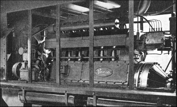 The engine and its radiator are mounted at the front end of the locomotive, as in automobile practice. It is provided with an electric starting motor having a sliding "Bendix" pinion, the teeth of which engage with similar ones on the rim of the engine flywheel. The various adjustable parts of the engine, as well as the fuel pumps, oil filters, water-circulating pump and starting motor, are all readily accessible, being mounted above the footplate. The fuel tank is mounted above the engine, and feeds the fuel injection pump by gravity. This pump, at the correct moment, supplies the small quantity of fuel required for combustion to the injector nozzles in the cylinder head. The Drewry locomotive is 11 ft. 6 in. long, 9 ft. 2 in. high and 5 ft. wide. The wheelbase is 4 ft., and the four wheels are each 2 ft. in diameter. This engine has a maximum speed of 15 m.p.h. and gives a starting tractive effort, or drawbar pull, of 3,360 lb. A range of Diesel locomotives has been built by the Hunslet Engine Company of Leeds, including both small and large types. The former are built in the 20, 30, and 40 h.p. sizes and use two-cylinder high-speed Diesel engines operating at speeds up to about 1,000 r.p.m. The engine speed is, however, controlled by a governor, so that during idling periods the speed can be automatically reduced to 300 r.p.m. ; this is an advantage when the locomotive is standing still during its normal working operations. The arrangement of the engine and radiator is the same as in the small locomotive described above. A two-speed gearbox with reverse gear is used for giving the usual forward speeds of 3 and 6 m.p.h. By using special gearboxes higher speeds of 6 and 12 m.p.h are made possible. The small Hunslet engines all use the 0-4-0 wheel arrangement. They weigh 4, 5, and 6 tons each, and at 3 m.p.h. will haul on the level loads of 106, 160, and 212 tons, respectively. At the higher speed of 6 m.p.h. these loads are halved. The larger Hunslet locomotives include a 200 h.p. model, four of which have been supplied to the L.M.S. Railway for shunting purposes. One of these locomotives, which is of the 0-6-0 wheel arrangement, bears the L.M.S. running number 7054. Embodying a number of new features, it is the largest of the series. It weighs about 30 tons, and develops a maximum of 200 h.p., which makes it about twenty-five per cent more powerful than any of the others previously supplied. The engine is a six-cylinder unit developing 180-200 h.p., with a normal speed of 900 r.p.m. It is manufactured under special patents, the whole of the engine frame being fabricated. The governor control is operated in conjunction with the lubricating oil pressure, so that, should the latter fail in service, the governor will be non-operative, this preventing mechanical breakdown due to lubricating oil failure. The camshafts, set on either side of the cylinder heads, are chain-driven from the fly-wheel end of the crankshaft. The drive is taken through a hydraulic coupling of the traction type, carried on the engine fly-wheel. Behind the coupling on the driving shaft is placed the rocking brake, which holds the shaft against the drag of the coupling while the gears are engaged, the rocking action being necessary to disengage the gears after the locomotive has been brought to rest. A clutch is placed between the hydraulic coupling and the gearbox, to facilitate gear changing. Perhaps the most important of the auxiliaries is the equipment for starting. This is carried out automatically, the power being derived from a two-stroke petrol engine. The whole of the control is manipulated from the cab, the operation being carried out in about twenty seconds under the coldest conditions.