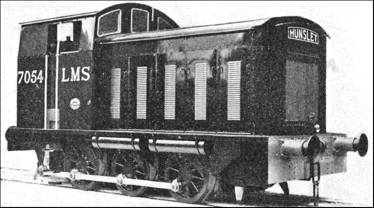 A compressor is arranged to supply air for the "Westinghouse" straight air brake, and to feed various auxiliary controls, such as the rocking brake and air whistle. The cab is of a new design and gives an exceptionally good look-out, besides being pleasing in appearance ; all the driving controls are duplicated on either side. The weight of the locomotive is 30 tons, and the gearbox gives speeds of 4, 8, and 13 m.p.h., the respective tractive efforts being 14,400 lb. on lower gear, 7,200 lb. on second gear, and 4,400 lb. on top gear. This locomotive is capable of hauling loads up to 700 tons. Other Hunslet locomotives supplied to the L.M.S. Railway include a 150 h.p. model fitted with an eight-cylinder engine. The L.M.S. has also introduced into service a Diesel shunting locomotive built by Messrs. Harland and Wolff. of Belfast. This six-wheeled locomotive, which carries the company's number 7057, has a total weight of approximately 27-1/2 tons, all available for adhesion. The tractive effort at starting is 11,200 lb. No. 7057 is designed for control by one man, and has the normal driver's cab provided with duplicate controls for easy operation from either side of the cab, in which there are windows to provide a clear view of the track both backwards and forwards. The two-stroke four-cylinder engine is designed to develop 175 b.h.p. at 1,100 r.p.m. It is fitted with an over-speed governor cutting out at 1,250 r.p.m. In normal service the revolutions are about 850 r.p.m., the higher speed being used for purposes of acceleration. The engine is started by compressed air stored in reservoirs at a pressure of 375 lb. per sq. in. To facilitate starting from cold, a glow plug, heated electrically from the accumulators, is fitted in each cylinder. The engine is of the airless injection type, and has a rotary scavenge blower, gear-driven from the crankshaft. An efficient uniflow system of scavenge enables the engine to develop a mean pressure equal to that of the four-stroke engine, with the added advantage of the even turning moment Of a two-stroke engine. Each cylinder has a separate fuel pump supplying fuel under pressure to the automatically operated fuel valves in the cylinder heads. The transmission is by means of a hydraulic coupling to a two-speed gearbox, and thence through a cardan shaft to the front axle of the locomotive. The reverse gear is engaged by means of dog clutches while the locomotive is at rest. The gearbox is the two-speed type in which the gears are constantly in mesh. All the gear-changing motions are performed by one lever duplicated on either side of the cab, so that the operation of the locomotive requires a minimum of skill and drivers easily become used to it. The final drive is by means of a high-efficiency worm gear. The radiators are cooled by a fan chain-driven from the engine crankshaft. The fuel tank has a capacity of 105 gallons and the water tank holds 55 gallons.