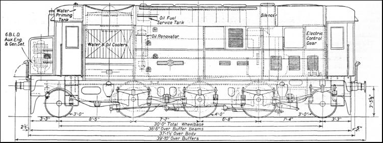 In the control compartment all control apparatus is mounted on a self-contained framework, and is easily accessible for inspection through swing doors in the driver's cab. This framework can be removed complete through the detachable roof of the locomotive to facilitate overhaul and replacement. The Diesel engine and generator set are mounted in the engine compartment. on a three-point suspension. The arrangement ensures that no racking strains from the locomotive structure are transmitted to the engine crankcase or crankshaft ; it also facilitates removal and replacement and obviates the necessity for re-alignment. The roof over the engine compartment is detachable, and this permits the power unit to be lifted out when necessary. Hinged removable doors on either side of the engine compartment give ready access to the power unit. The two driving motors are mounted on the two outside axles and are supported by brackets from the locomotive underframe. The brushgear and commutators can be inspected through doors in the locomotive floor. The complete motors can be removed cither by lifting the superstructure clear of the axles, or, if more convenient where no crane is handy, the motors can be dropped down into a pit, the supporting brackets being removable. The cab is of the fully-enclosed type, and is fitted with an electric heater, which can be controlled by the driver. A cupboard is provided for the driver's clothes, and a small electric hotplate enables him to cook food. In this locomotive is embodied the first application of electric torque control. The general principle of this system is that the Diesel engine speed is held to a pre-selected value by varying the electrical loading to suit the existing track load of the locomotive. This control is entirely automatic and is achieved by means of instantaneous regulation of the main generator field through a pulsating electric torque delay. Overloading of the Diesel engine is thus entirely avoided and the whole operation is made foolproof. The manipulation by the driver of a single lever controls the whole equipment automatically. The Diesel engine is one of a series of medium speed engines developed and standardized for traction and industrial work. These engines are made with six, seven, or eight cylinders, and develop 300, 350, or 400 h.p. respectively at 600 r.p.m. Each cylinder has a bore of 10 in. and stroke of 12 in. A vertical water cooler is mounted at one end of the locomotive, a centrifugal pump being driven from the camshaft. In addition, the lubricating oil is circulated by means of an engine-driven pump through a separate section of the cooler. The cooler is used with an electrically driven fan which is thermostatically controlled, to maintain the lubricating oil and cooling water at the desired temperature. The superstructure is of steel, housing completely the radiator, engine and generator, control framework, and all auxiliary apparatus. The roof is made detachable and in sections to facilitate removal of the power unit and auxiliaries. Dual brake equipment is fitted, comprising straight and automatic airbrake and vacuum-brake ; thus the locomotive is able to handle any type of stock on British railways. In Shunting work the straight air brake is used, but the automatic brake is available for local passenger service ; the vacuum brake is available for the same service. A screw-down hand brake operating through the power-brake mechanism is also fitted.