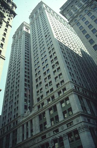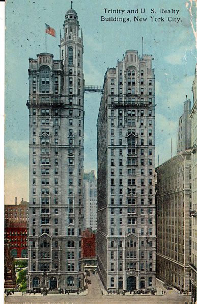Francis Hatch Kimball: Trinity and US Realty Buildings, NYC, 1904-5,1906-7. Steel frame footbridge added 1912. 260' ht (left); 275' (rt) |