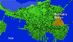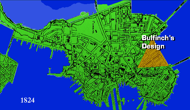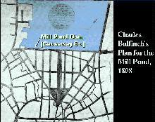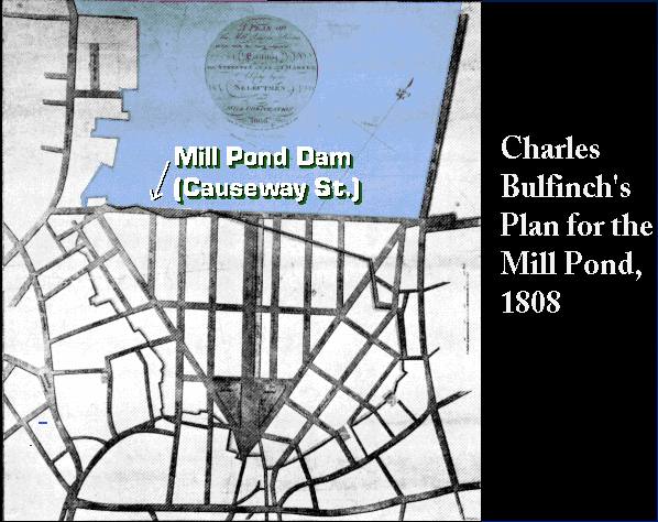 The trimount is commemorated in the modern name of Tremont Street. Mount Vernon was cut down early in the 1800s, and the soil was filled along Charles Street. Beacon Hill was next, cut down between 1807 and 1824; the soil from Beacon Hill helped fill in the Mill Pond in the North Cove. The North End was thus joined more solidly to the rest of Boston. Charles Bulfinch designed the pattern of streets for the new land of the Mill Pond; the outermost edge of that plan is now Causeway Street. Pemberton Hill was cut down rapidly in 1835, and the fill was dumped along the North side of Causeway Street, near the modern North Station.