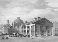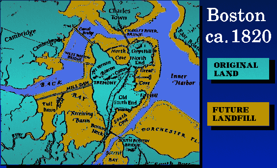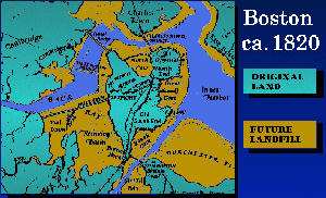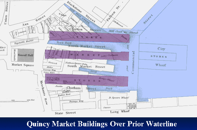 As recently as 1830, Boston was still very much a marine city, with Quincy Market and the Custom House immediately adjacent to the harbor. And, of course, the Back Bay was still filled with water. The modern day visitor to Quincy Market is probably not aware that they are standing on the ancient shoreline of Boston Harbor.