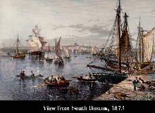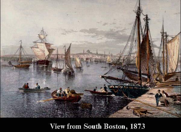 Boston at mid century was a thriving metropolis, beginning to burst its narrow confines of the original terrain. Boston Common, which had been a fixture since the 17th century, was well established, but the public garden was hardly begun at this time. Beacon Street was just being developed, and a railroad station occupied a prominent position at the south edge of the Common, on the right. The modern city of Boston emerged from the waters, an Atlantis in reverse.