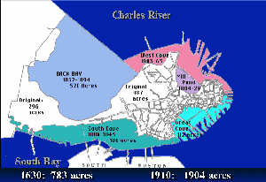 The original profile of Boston remains beneath the surface of the modern city. When one realizes the dimensions of the changes enacted upon this site, one is filled with a new appreciation for the achievement of earlier centuries. The landfill projects in Boston filled in the bays and smoothed out the irregularities of the Shawmut peninsula. The historical sequence of landfill projects in Boston also helps explain some of the peculiarities of the modern urban landscape. Boston streets, laid out in the 17th and 18th century, followed a coastline which has moved and avoided hills which are no longer there. One can safely dismiss the myth that the tangled patterns of Boston streets were established by colonial cowpaths.
