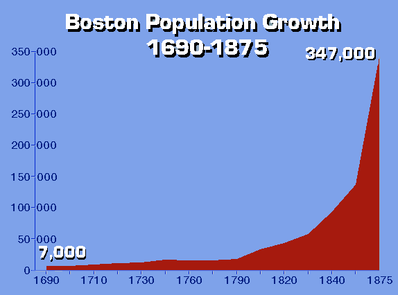 The population of Boston was still small in 1790, being only about 18,000 people. Immigration in the 19th century brought unprecedented growth. By 1875, 347,000 persons lived in Boston.