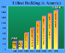 These same factors which encouraged the landfill of Boston, likewise encouraged builders to create ever taller buildings all over America. One can see a similar progression in the heights of the tallest buildings in America in the last two centuries. In 1846, the tallest building in the United States was Trinity Church in New York, with a height of 284 feet. By 1913, the Woolworth Building had attained to 55 stories in height, and was itself outdone by the Chrysler and Empire State Buildings in the 1930s. The World Trade Center reached 100 stories in 1971, and in 1974, the Sears Tower was built at 110 stories, or 1,454 feet.