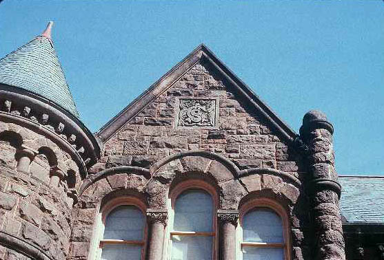 This library is strongly influenced by the Richardsonian Romanesque style of the Crane Public Library in Quincy, MA, 1881.