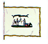 An original is on display at the George Washington Masonic National Memorial in Alexandria, Virginia. The standard bears an elaborate, delicately painted scene depicting a horse, an officer, a blue standard with a circle or oval of stars, a woman representing the Genius of Liberty supporting a shield of the United States, and a spread eagle. Above the figures is a yellow-gold scroll with the motto: "Conquer or Die". The standard dates after 1782 when the shield and eagle were adopted into the seal of the United States.