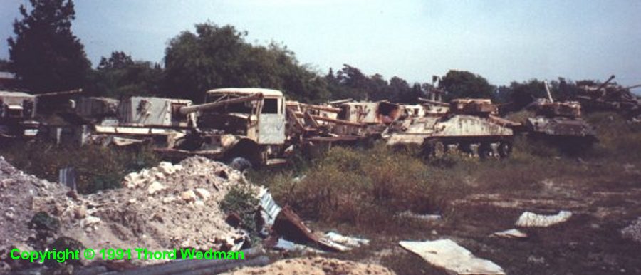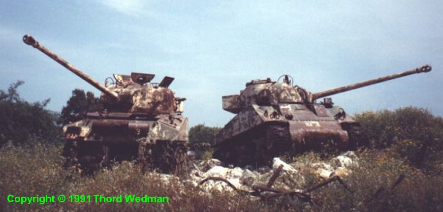Thord Wedman of Sweden served as a UN peace keeper in Lebanon. He took this picture of an AFV scrap yard in Tyre barracks in the city of Tyre in 1991. The pictures shows at least four Sherman Fireflies, one turretless Sherman and two Charioteers. | ||