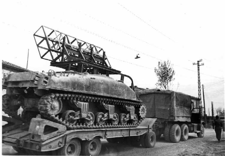 1945 and equipped with a mixture of assault engineer equipment: Sherman