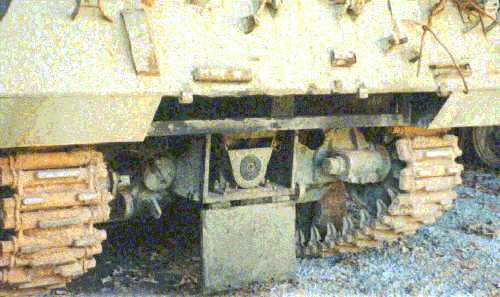 This photo shows the rear of the hull. Clearly visible is the cut- out from the upper hull overhang and the extended lower hull to accommodate the V12 diesel engine. Note: see the Beltring 2000 page for pictures of a Yugoslav M36 clad in rubber conveyor belting. |