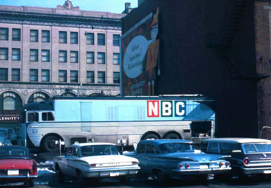 Mobile unit for the NBC Network coverage of the 1964 First in-the-Nation New Hampshire Primaries. This was the network's headquarter location, with an additional remote located in the state capitol of Concord, at the Highway Hotel. This location is now the Verizon Building, Leavitt's across the street, is now Citizens Bank. (click here for ) A previous Photo-of-the-Month showing the store-front studio. Coming soon, a retro presentation of the NH Primaries coverage, pre ENG and satellite facilities. Check this page again for the link.