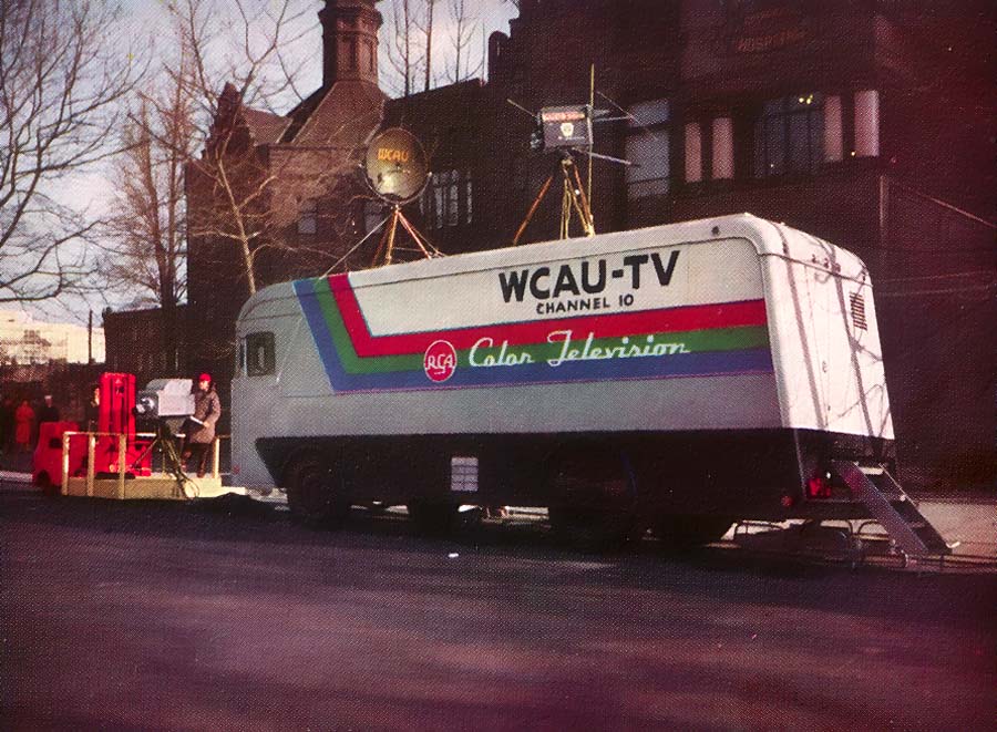 The Philadelphia CBS outlet, on Monday, January 2 (1956) aired over three hours of the Mummer's Parade. First time that the parade was telecast in color. Two color mobile trucks were leased from RCA. Each mobile unit had two TK-41 color camera chains and two TM 10B 15-inch color monitors as well as three TM-6C master monitors. One mobile unit was located at the City Hall reviewing stand. The second at the start of the parade route, at Porter Street in South Philadelphia. Both were linked to WCAU master control using telephone company lines.