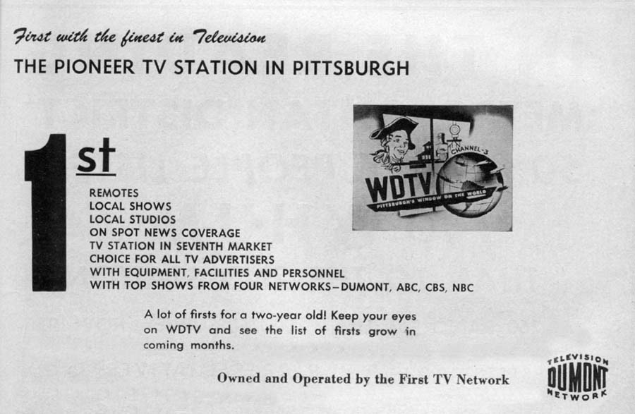 WDTV was the third DuMont owned and operated television station. New York, NY (WABD) and Washington, DC (WTTG), being the other two.