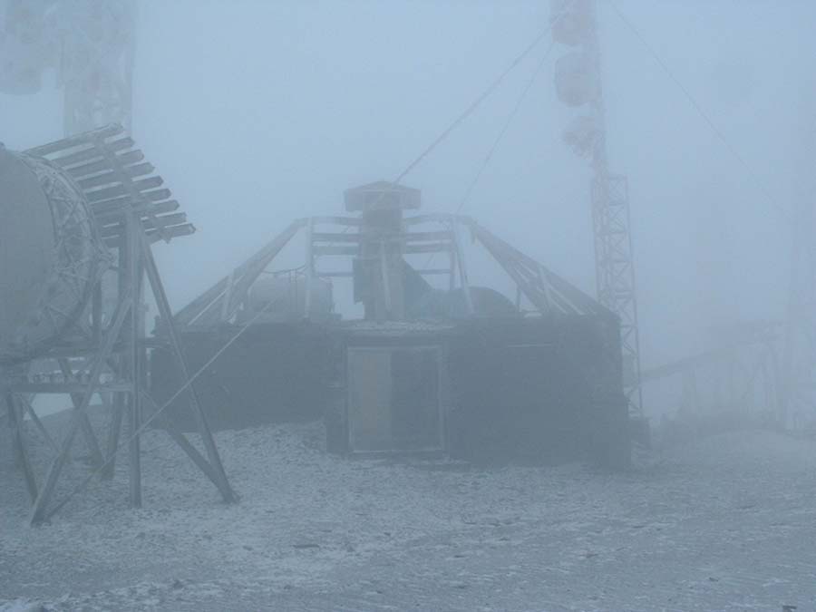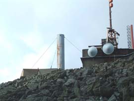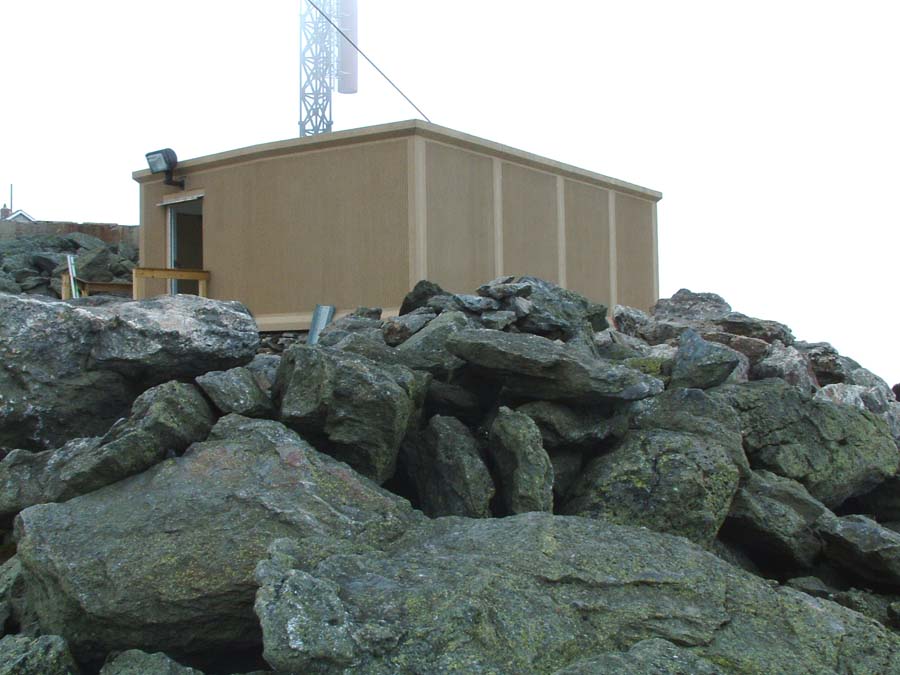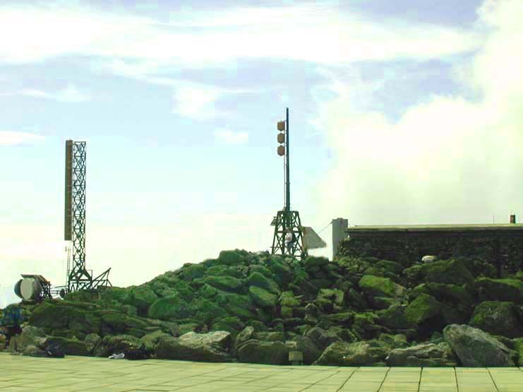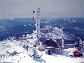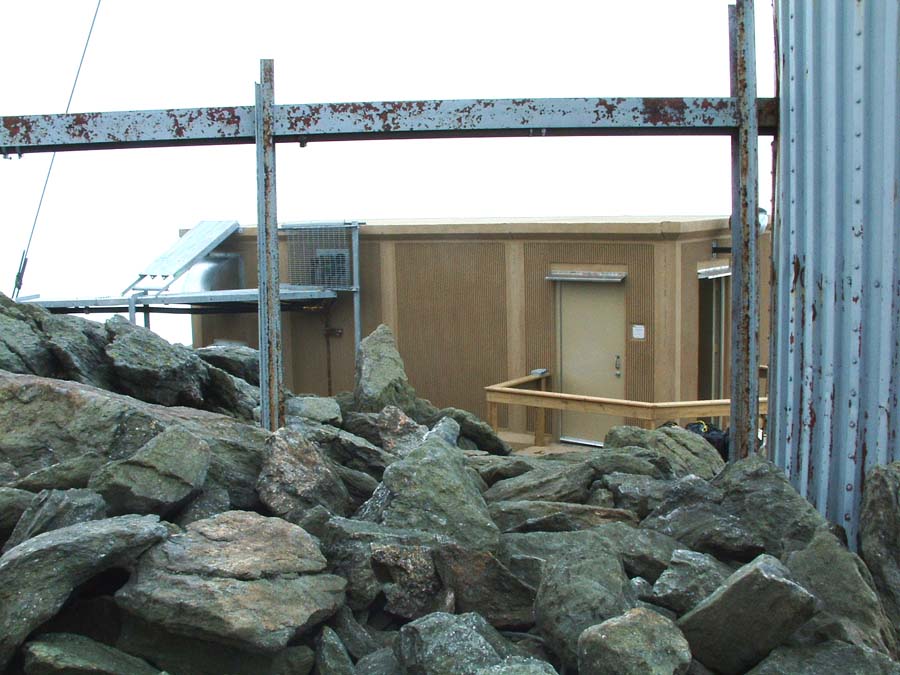 On Friday October 10, 2003, I made a pilgrimage to the mountain top, via the auto road. Six inches of snow and drifts up to four feet had closed the road earlier in the week. The day of my visit saw clear skies with afternoon temperatures in the mid 50's with no wind. (Official Mount Washington Observatory readings....HI of 54 degrees, average wind 25mph) I was fortunate to visit with Steve Vanni and his crew, as well as Drew and Rawn from Yankee Microwave. Steve Vanni's Technet Systems is the prime contractor for rebuilding the WHOM plant on the mountain.
