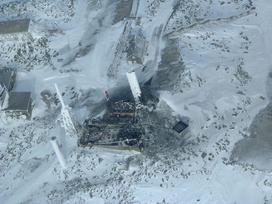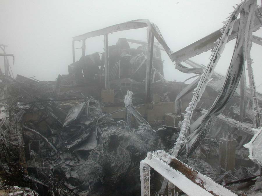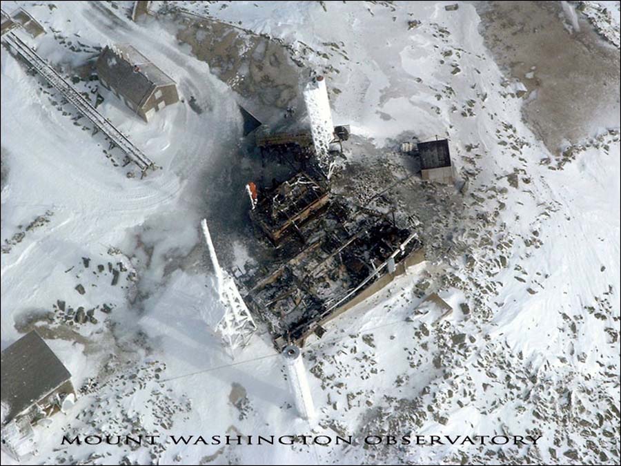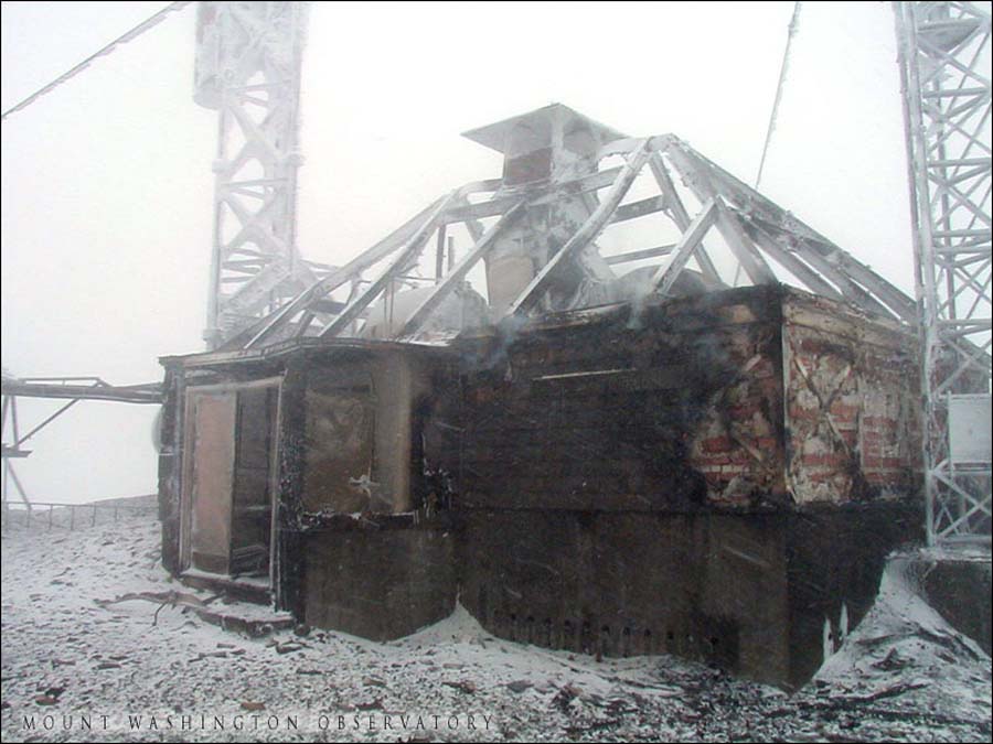 Aerial photograph of Mt. Washington taken February 11, 2003 by Drew Knightly of Yankee Microwave, Inc Left photo is wide overview, closeup on right clearly shows damage. The Yankee Power Building was a part of FM history on Mount Washington and the nation. The Yankee Power Building/House is so called because it housed the original power plant for Yankee FM. The staff and transmitter were housed in the Yankee Building, which is separate, and was not affected by the fire.
